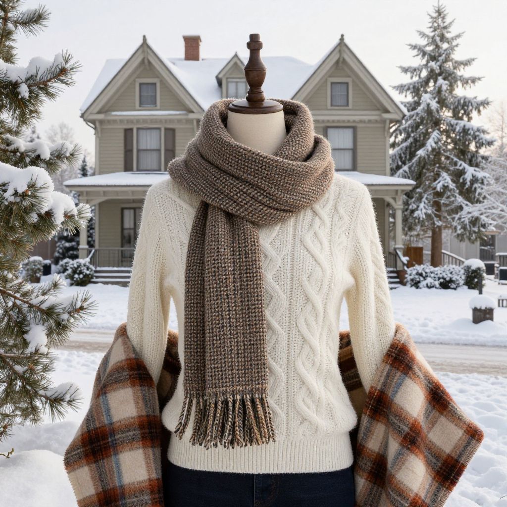 Winter background preppy style featuring a cozy snow-covered Victorian house with classic tweed scarves, cable-knit sweaters, and warm plaid blankets, soft morning light filtering through frosted pine trees, elegant winter fashion in a charming small town scene.