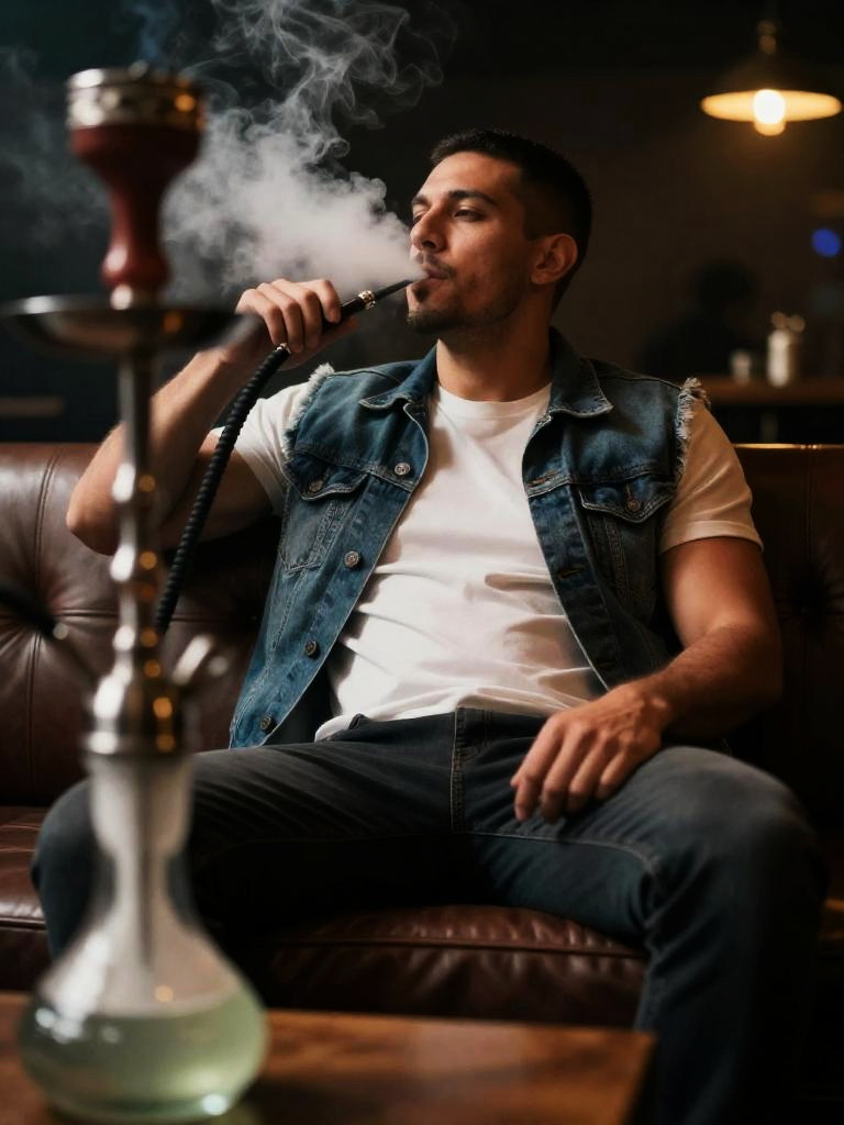 Man smoking shisha, adult man reclining on a leather sofa in a dim lounge, broad-shouldered man with close-cropped hair and faint beard wearing casual t-shirt layered under open denim vest with dark trousers, holding the hookah hose close to his mouth as he exhales a thick cloud of smoke, large modern hookah with tinted glass base prominently blurred in the foreground, low depth of field, atmospheric shadows and soft warm highlights, cinematic lifestyle photograph, ultra realistic, high resolution