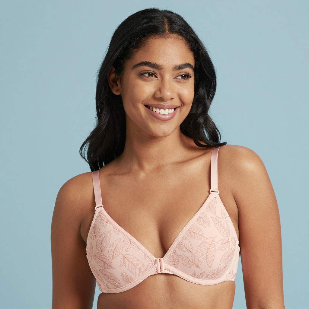 Photograph of a woman with long black hair, light brown skin, and dark eyebrows. She is smiling, wearing a light pink bra with a leaf pattern. Background is a solid light blue. She is looking slightly to the right. Bra has thin straps and a small clasp at the front. Her upper body is tilted slightly to the left.