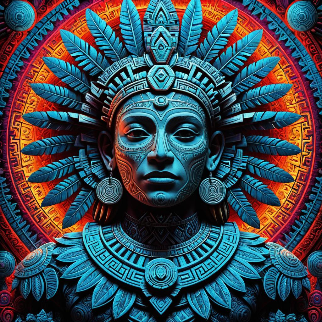 Highly detailed and hyperrealistic depiction of an Aztec god, featuring intricate blue stone carvings and elaborate feather headdress. The artwork blends psychedelic and visionary art styles, enhanced by fractal and sacred geometry patterns in vibrant orange and blue hues. The subject is adorned with ornate jewelry and traditional Aztec motifs, making the image a striking piece of digital fantasy art.