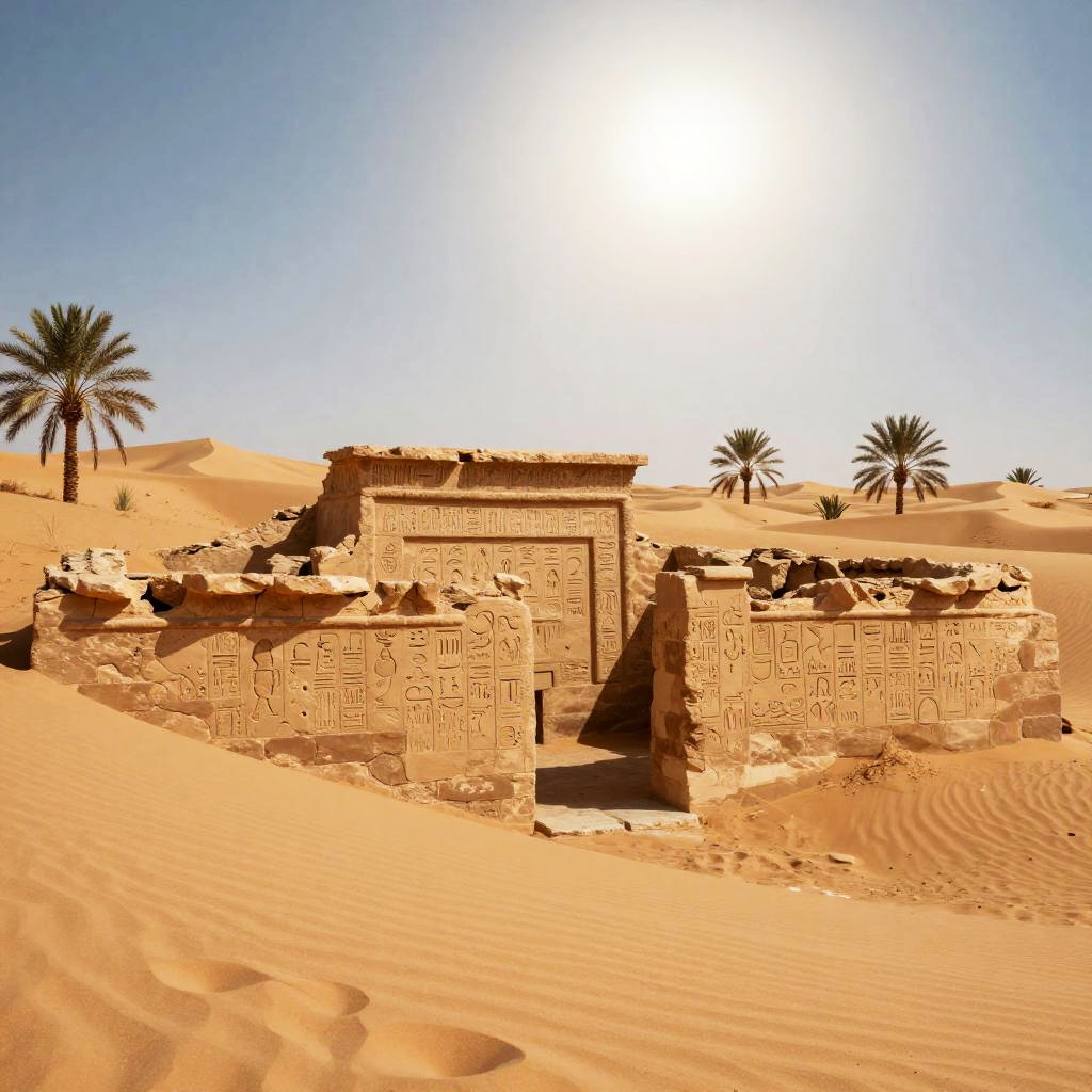 Ancient desert ruins under a blazing sun, surrounded by golden sand dunes, mysterious hieroglyphs carved into crumbling stone walls, with scattered palm trees and blue sky