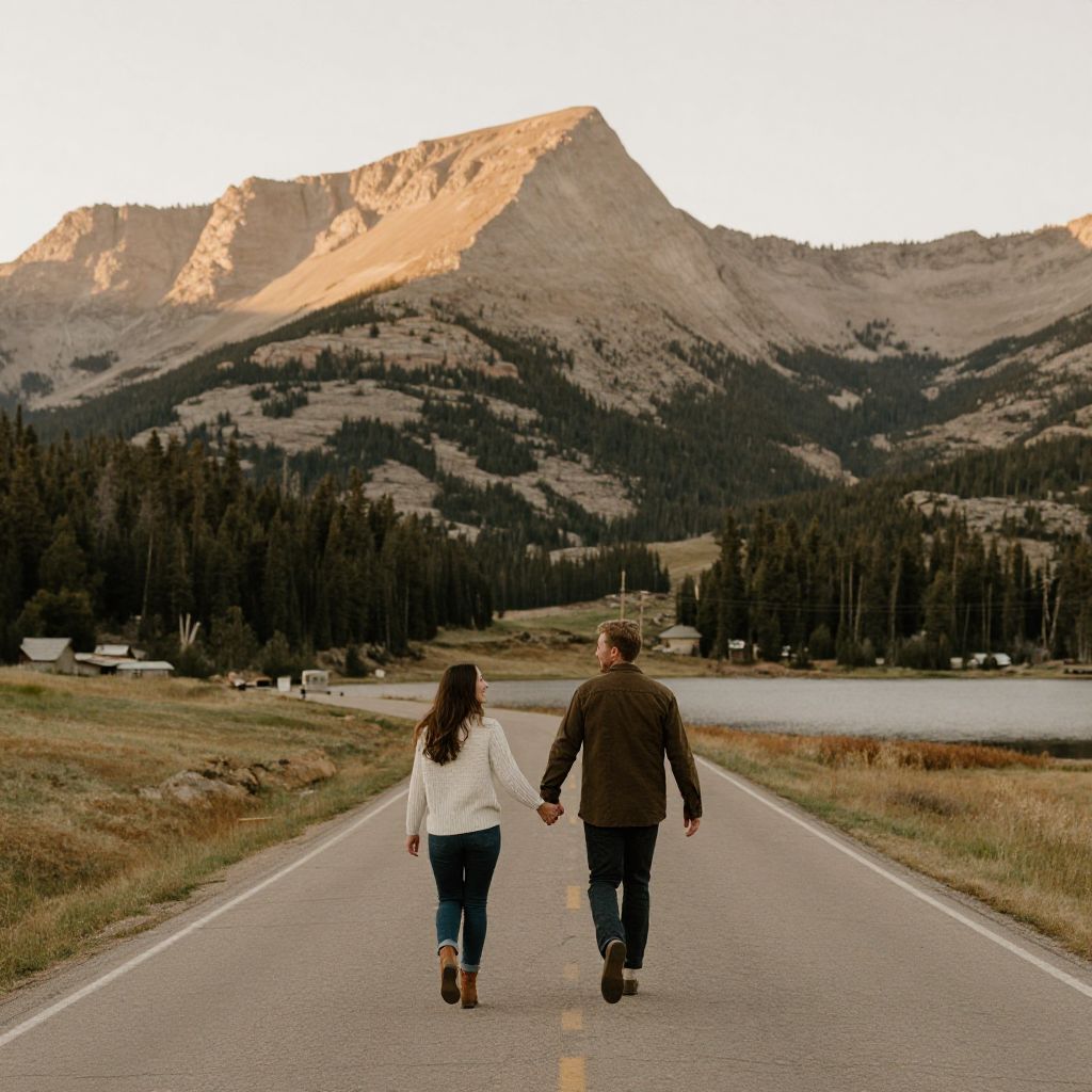 Photograph of a couple holding hands, walking down a road towards a sunlit mountain range, surrounded by forest and a lake.