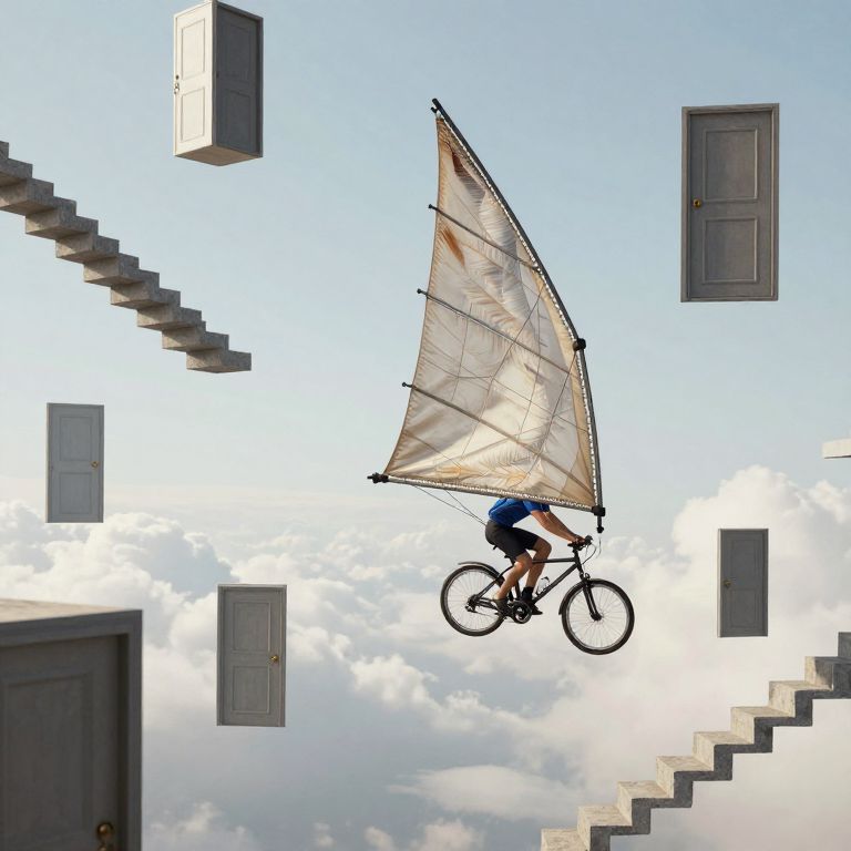 Flying bicycles pull against gravity using feathered sails, navigating through a sky thick with floating staircases and floating doors.