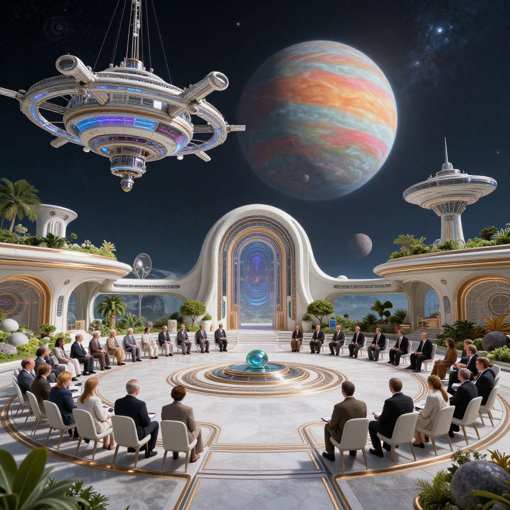 Ashtar leading a peaceful interstellar council on a luminous space station orbiting a colorful gas giant, elegant alien architecture with a harmonious blend of nature and machinery, high detail sci-fi visionary environment.