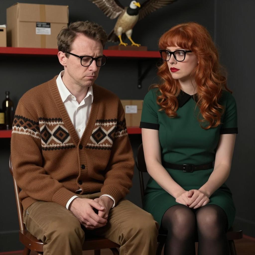 A bus interior. Blonde woman with short hair, large glasses, white shirt, black vest, green bow tie, looking at a red-haired man with a mustache, gray suit, white shirt, red tie. African-American man in blue shirt in background. Woman's expression is curious, man's expression is serious. Bus window in background shows green grass and trees.