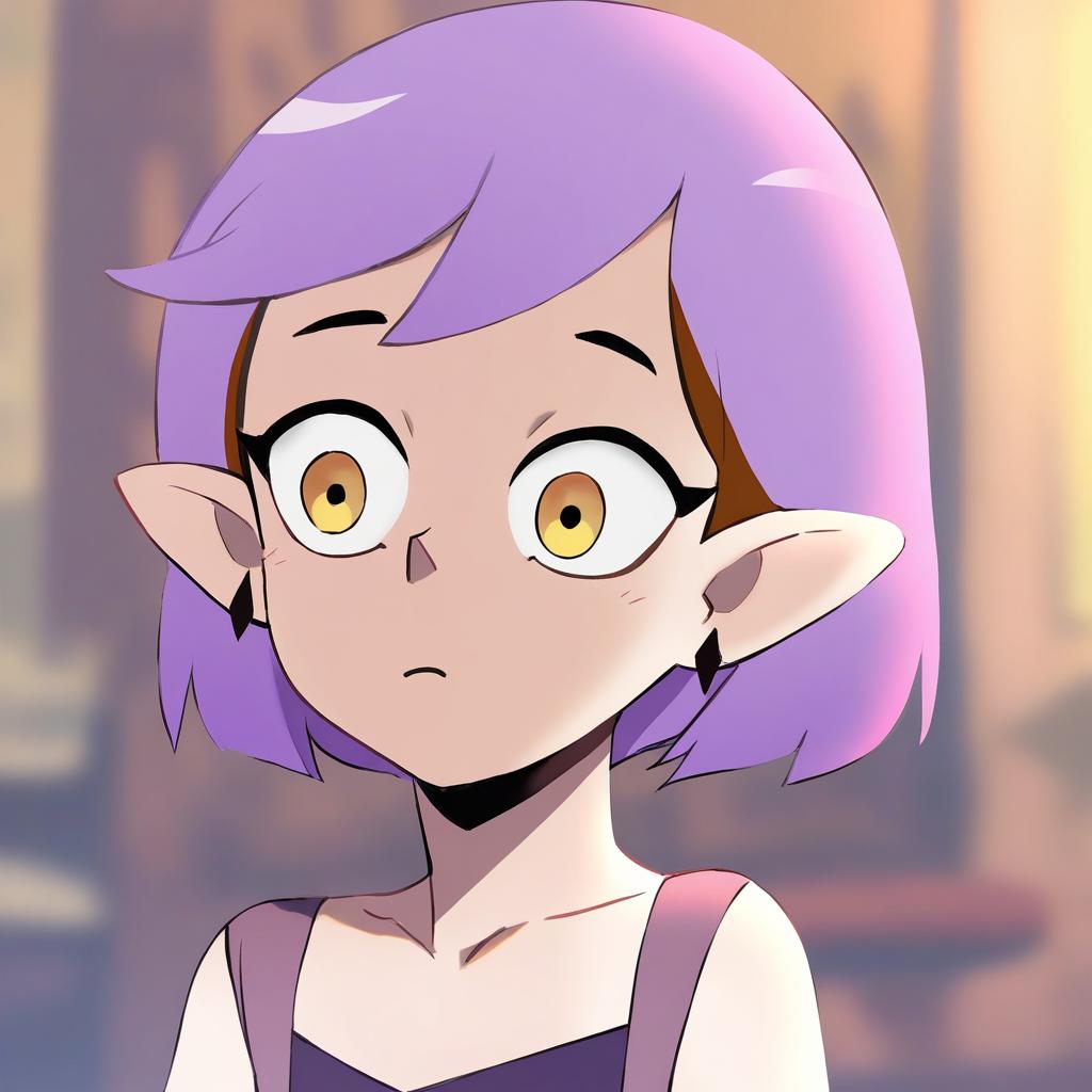 Amity blight, the owl house, 1girl, pointy ears, yellow eyes, purple hair, short hair, brown hair, by artist purin a la mode (popup), illustrious