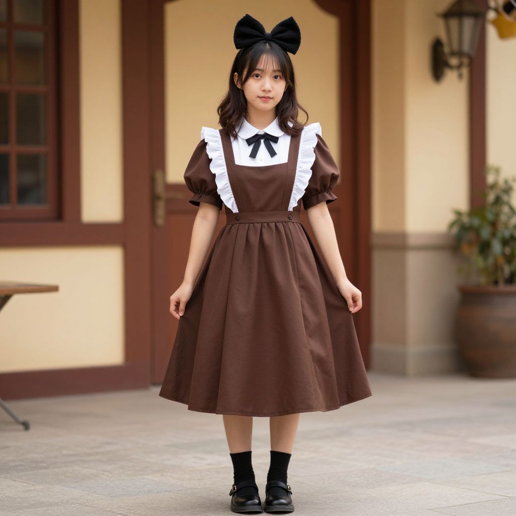"Woman Tavern Maiden Costume, woman in brown dress standing outside of a building with a black bow"