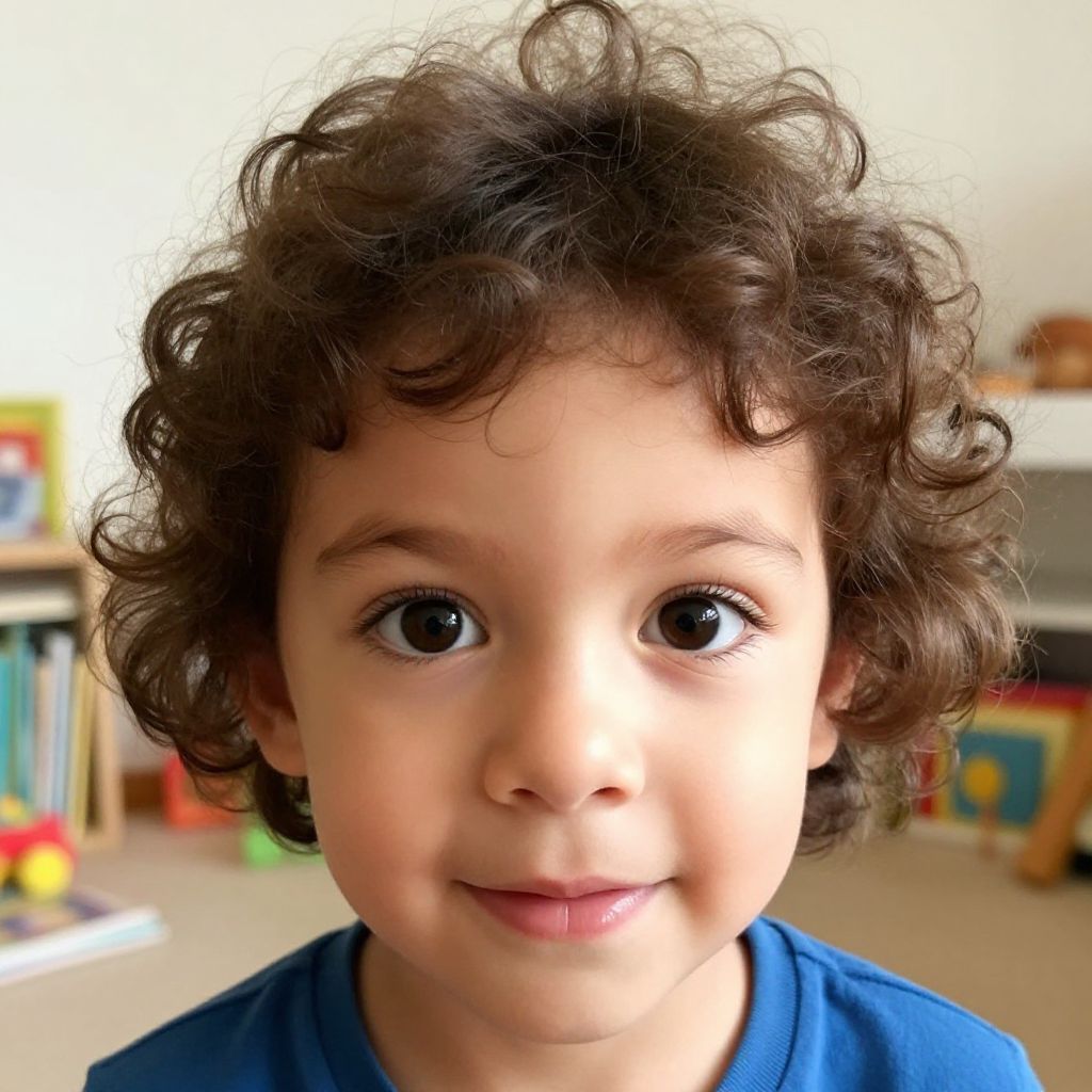 Close up face prompt of a child with bright eyes and curly hair, playful expression, soft natural light, in a cozy indoor room with books and toys, warm and friendly atmosphere, children's book style realism.