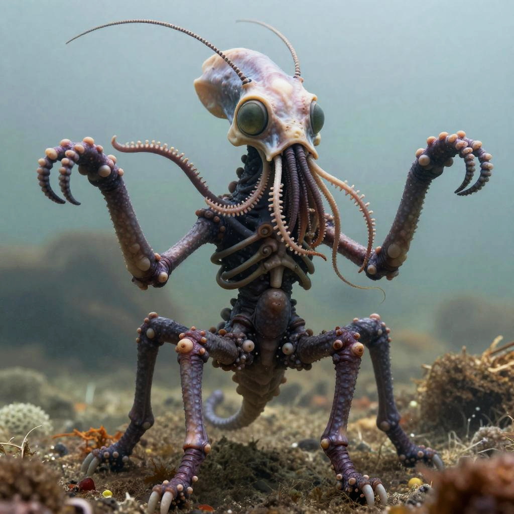 A unique hydrothermal-vent adapted octopedal chimera with biocarbon plating, filamentous antennae and kelp-like jaw tendrils with a skeletal head, long antennae, two compound sunken greenish gray eyes, indented jaw filled with tendrils, two short, large arms, skinny thorax with thick waist, elongated short, stocky abdomen, and eight short powerful legs ending in three-toed feet