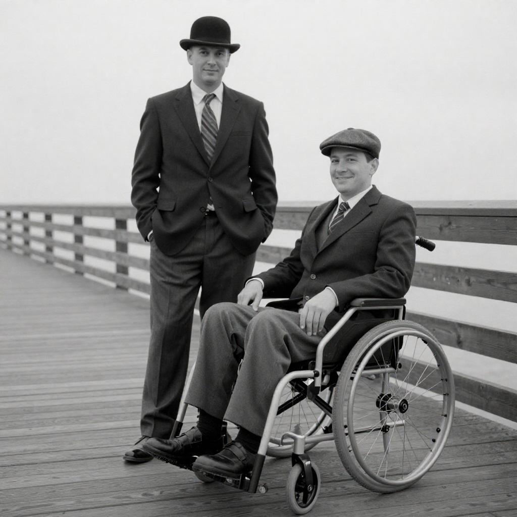 Black and white photograph of two men on a wooden boardwalk. Standing man in dark suit and bowler hat, hands in pockets, looks forward. Seated man in wheelchair, wearing dark suit and flat cap, reclines with hands on lap, smiling. Logs and railing in background.