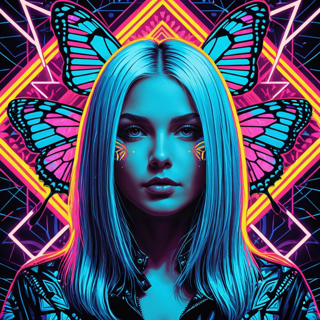 A vibrant and surreal poster illustration featuring a woman with long, braided orange hair adorned with green leaves and flowers. The background showcases a whimsical meadow with lush green hills, tall pine trees, colorful flowers, and a small house. The sky is filled with psychedelic patterns, stars, and circular designs radiating warm hues, enhancing the artwork's dreamy and detailed style. The woman's face is softly illuminated, emphasizing her serene expression and detailed features.