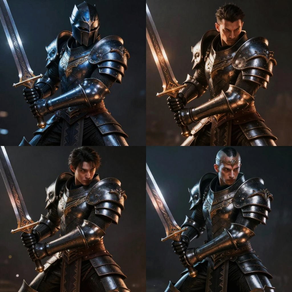 This is a digital artwork collage featuring four dynamic close-ups of fantasy armored warriors. Each warrior is adorned in dark, metallic armor with intricate designs, wielding glowing swords. The backgrounds are dark and moody, with light sources highlighting the warriors' fierce expressions and powerful stances. The top two images show a warrior in blue armor, while the bottom two depict warriors in darker, more worn armor. The overall style is epic and action-packed.