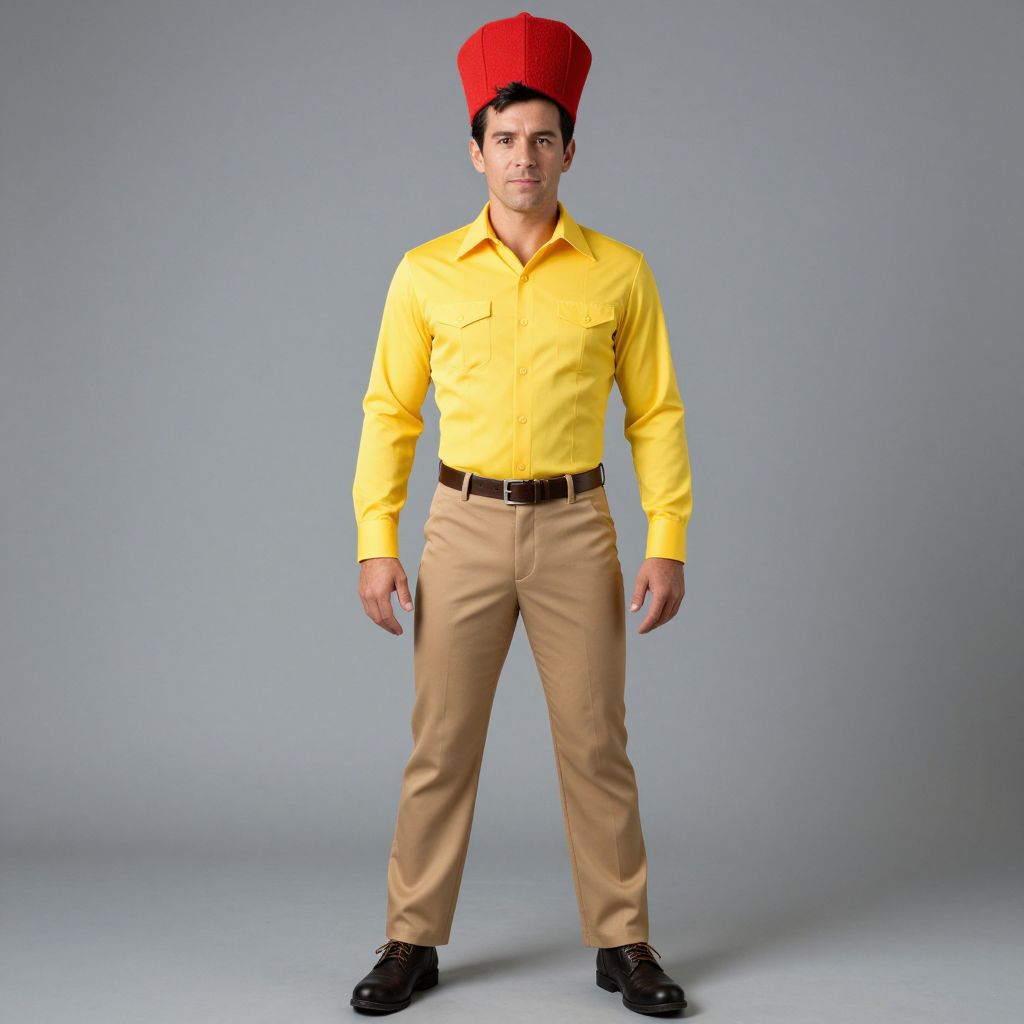 Speedy Gonzales Costume, man in a yellow shirt and tan pants with a red hat