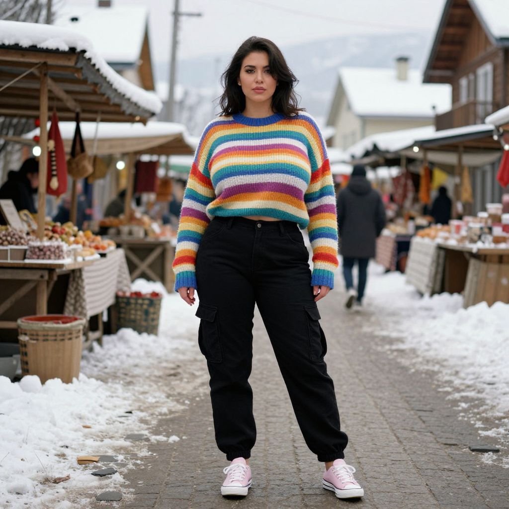 A busty woman in casual streetwear, wearing a multicolored striped sweater with ribbed cuffs and a relaxed fit, paired with black cargo pants and pale pink low-top sneakers, stands at an outdoor market in a snowy village. The scene is captured in the vibrant style of Ektachrome film stock. Sexy. Pretty face and beаutiful eyes. Big breasts