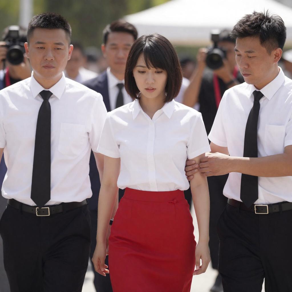 Photograph of a public event showing a young woman with short black hair, wearing a white blouse and red skirt, being escorted by several men in white shirts and black ties. One man on the right is adjusting her sleeve. Background includes other men in suits, photographers with cameras, and a sunny outdoor setting.