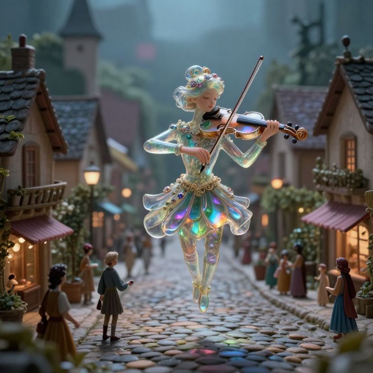 An enchanting scene unfolds with a whimsical 'bug's-eye view' perspective as a floating violinist serenades a bustling village below. The ethereal musician plays an enchanted instrument made of iridescent glass and precious metals, casting mesmerizing reflections onto the quaint cobblestone streets and lively citizens. This surreal portrait captures the delicate balance between whimsy and melancholy, inviting viewers to explore a dreamlike world where fantasy intertwines with reality, evoking a profound emotional journey through colors, textures, and light.