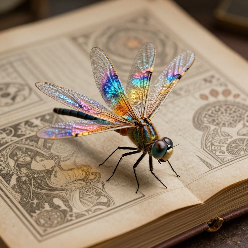 Photograph of a vividly iridescent dragonfly with translucent wings reflecting blue, pink, and yellow hues, perched on an open, aged book with intricate black and white illustrations. The dragonfly's body is black and green, with delicate, veined wings. The book's pages are yellowed, and the background is blurred, focusing attention on the dragonfly. The texture of the book's paper is visible, adding a sense of antiquity to the image. The dragonfly's intricate details contrast with the detailed, monochromatic illustrations in the book.