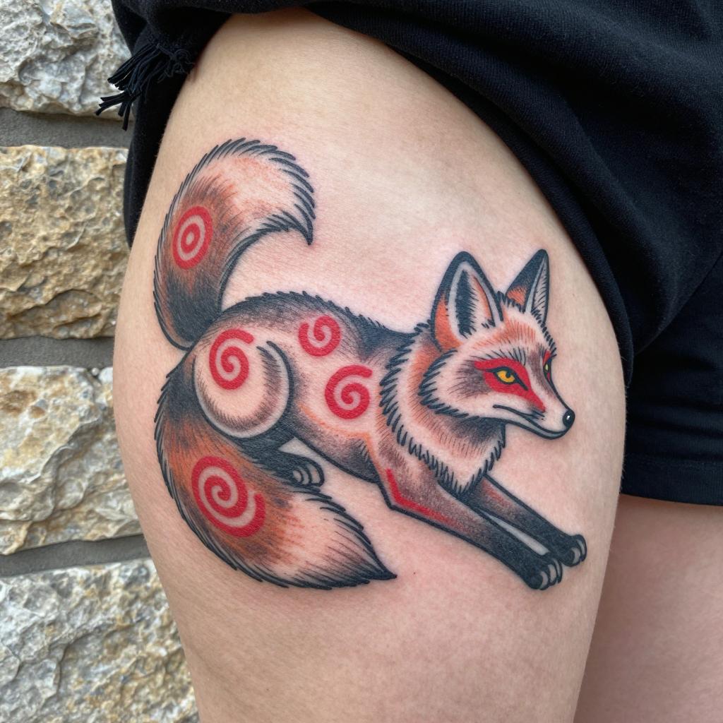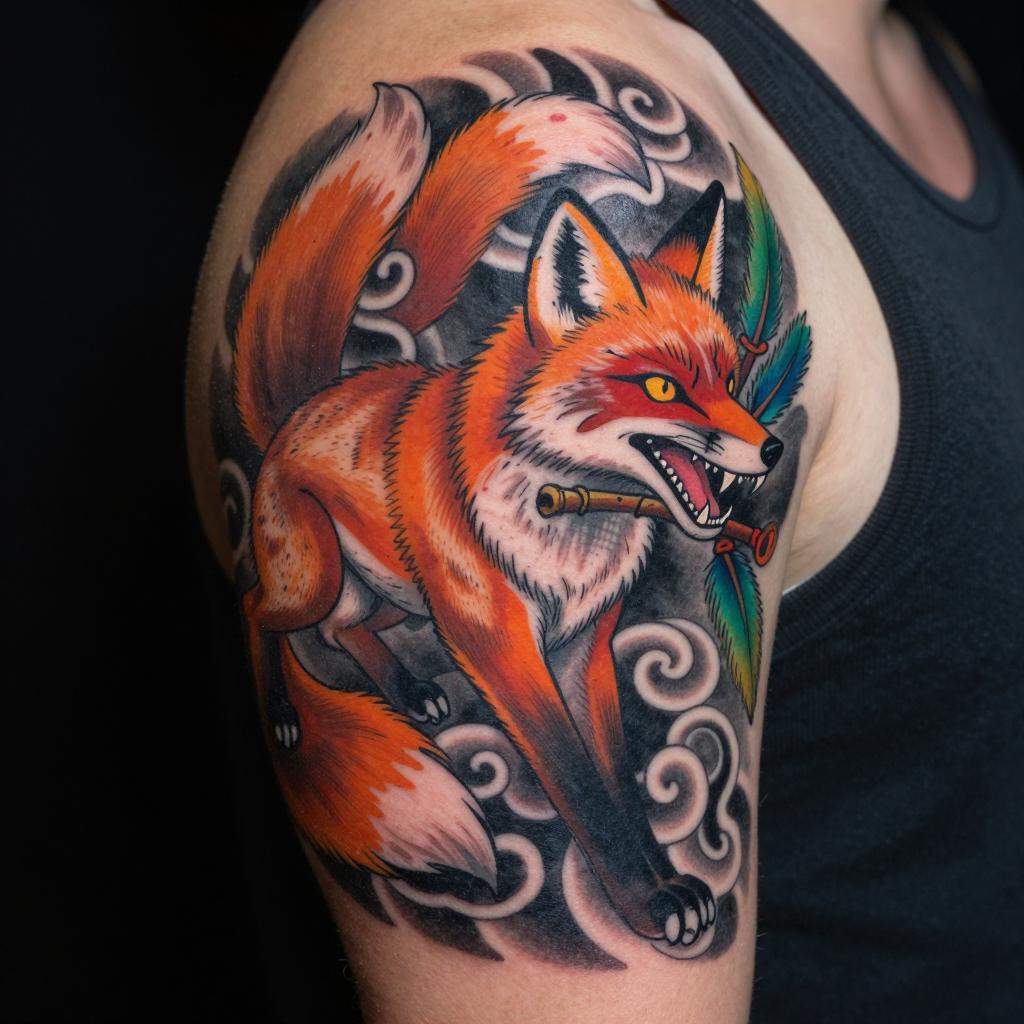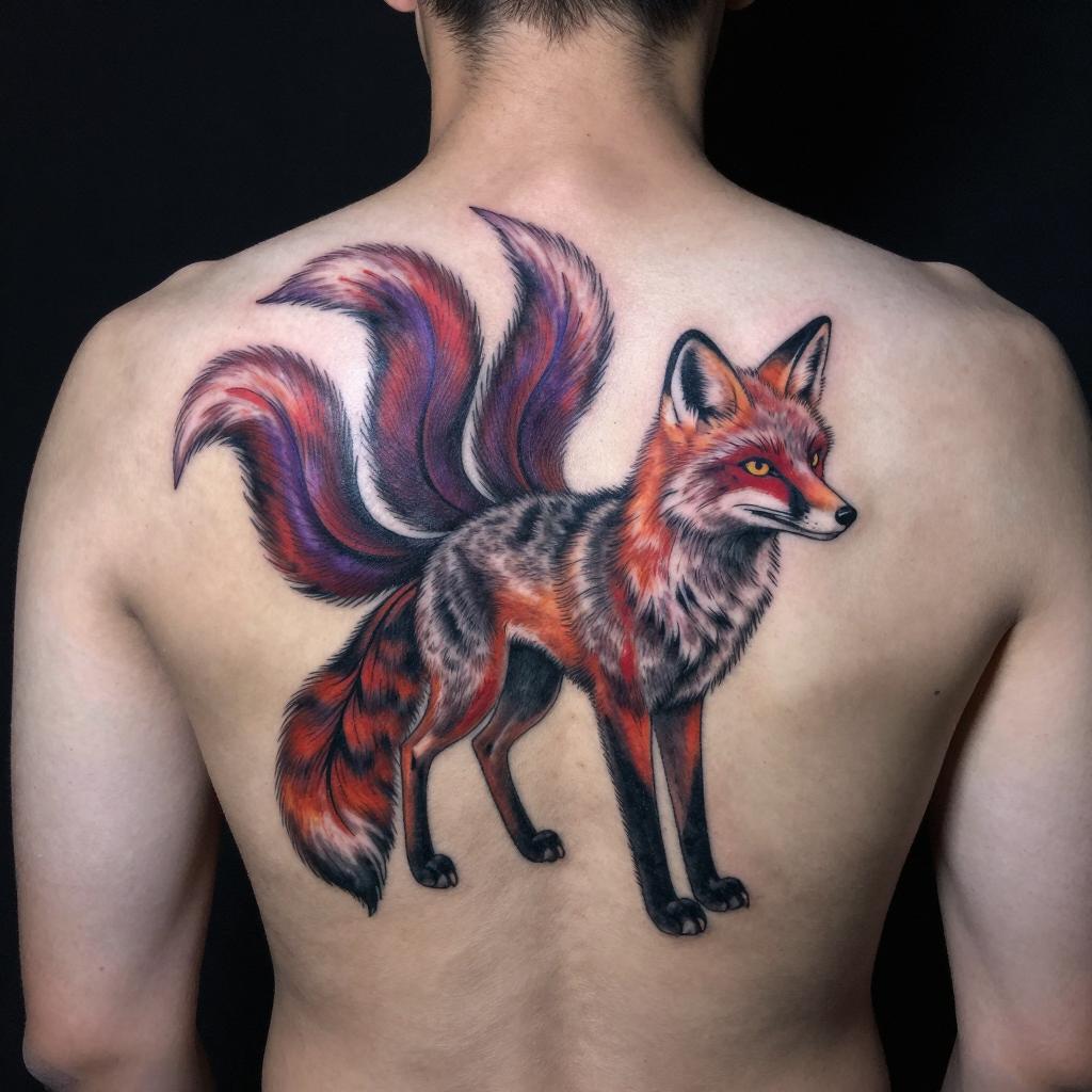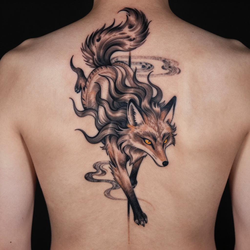 Black and grey tattoo on a person's upper back. A stylized, swirling fox-like creature with flowing, wavy hair and intense eyes. The creature is floating above a vertical line, with abstract, cloud-like shapes in the background. The tattoo has intricate line work and shading. The person has light skin, and only their upper back is visible.