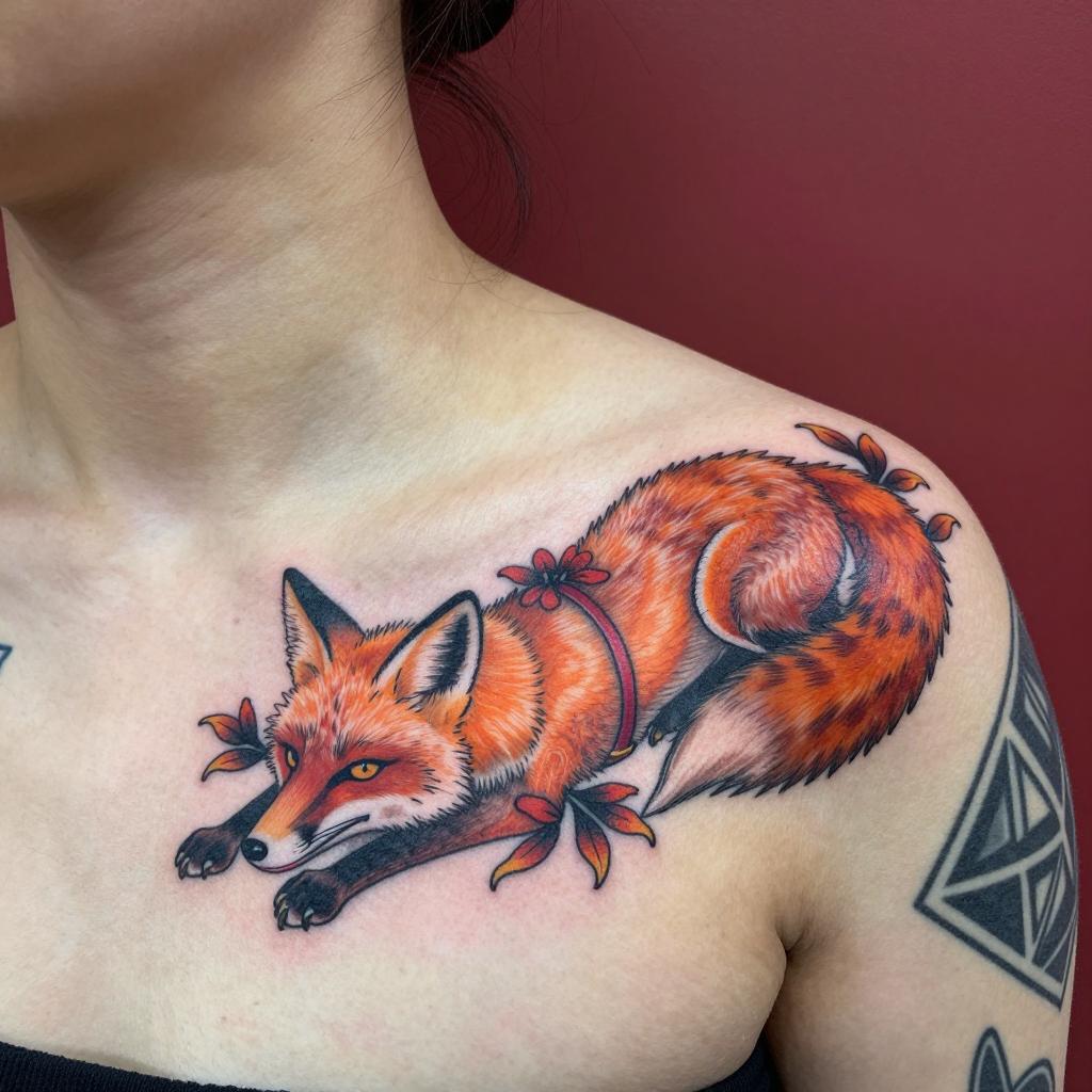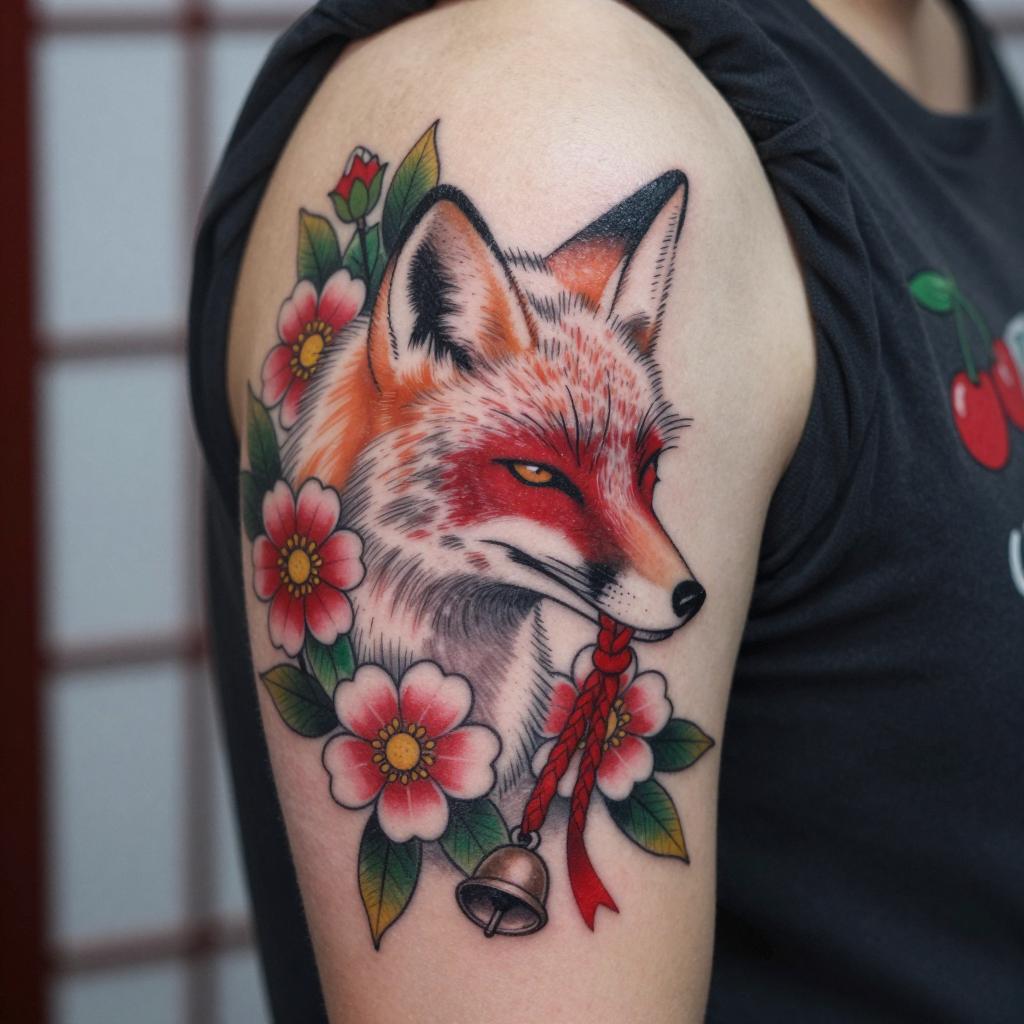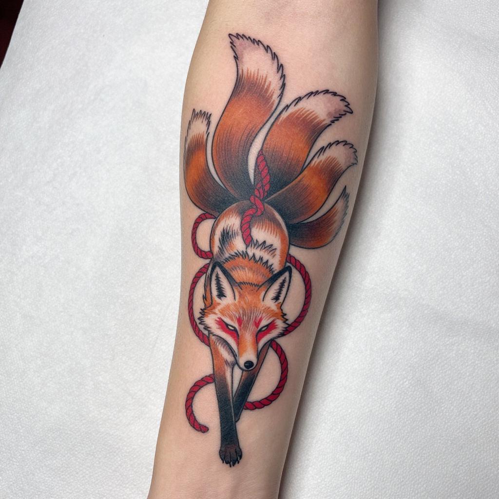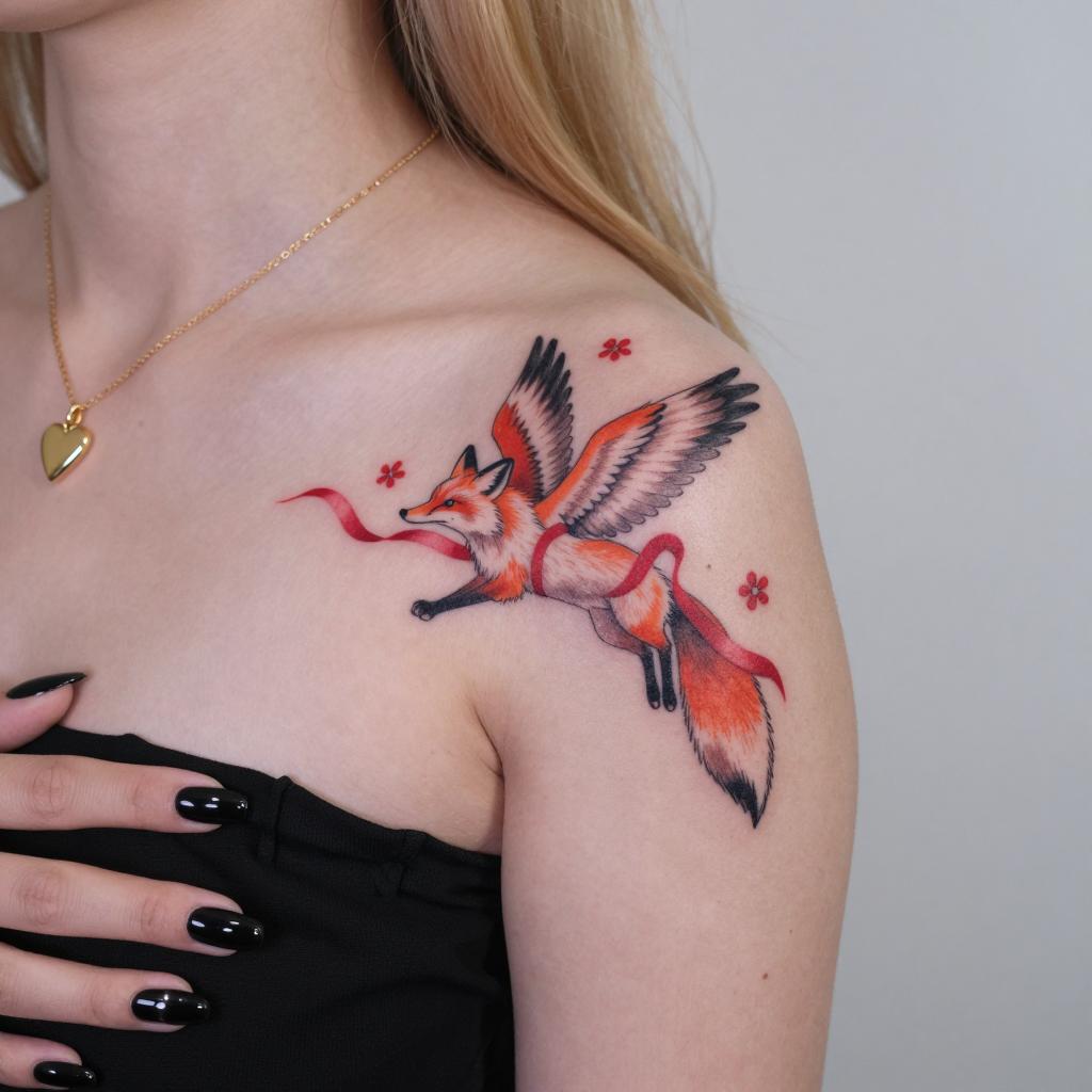 Black and grey tattoo on a person's upper back. A stylized, swirling fox-like creature with flowing, wavy hair and intense eyes. The creature is floating above a vertical line, with abstract, cloud-like shapes in the background. The tattoo has intricate line work and shading. The person has light skin, and only their upper back is visible.