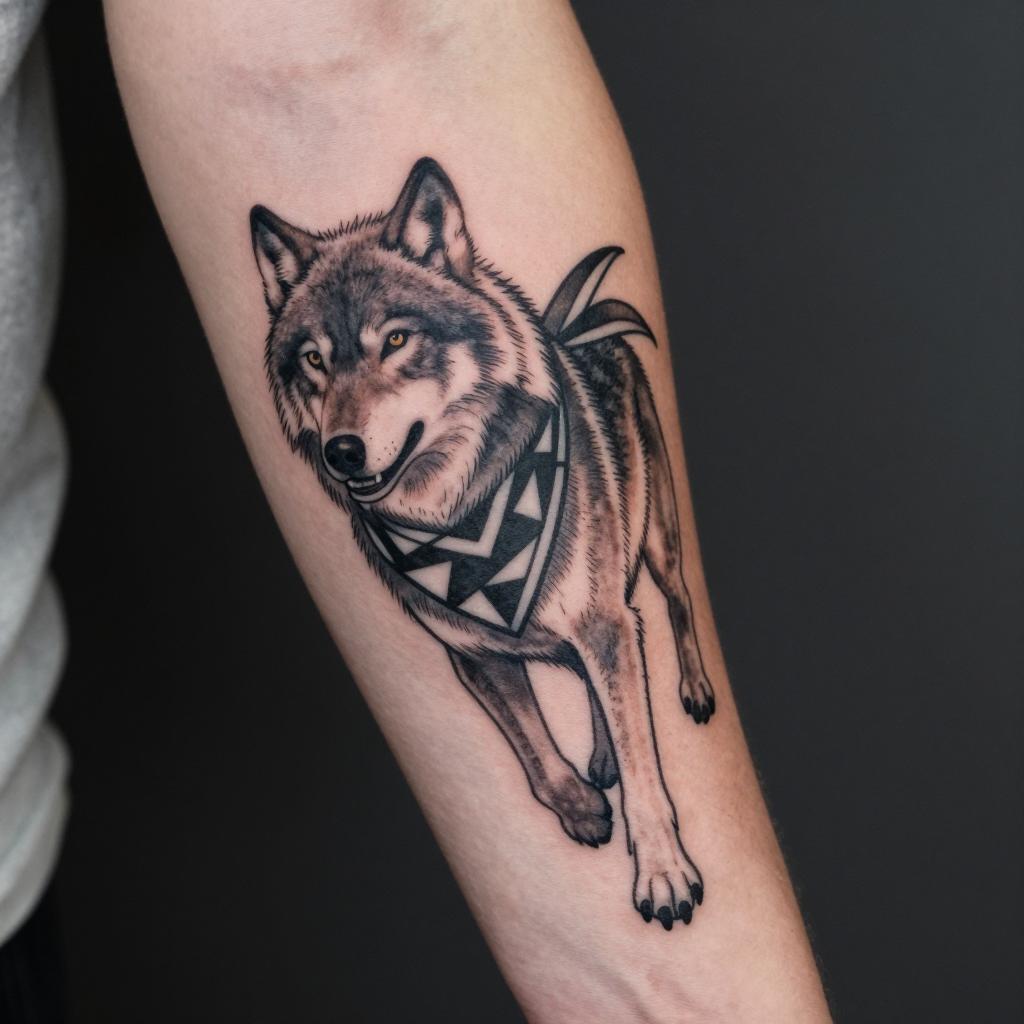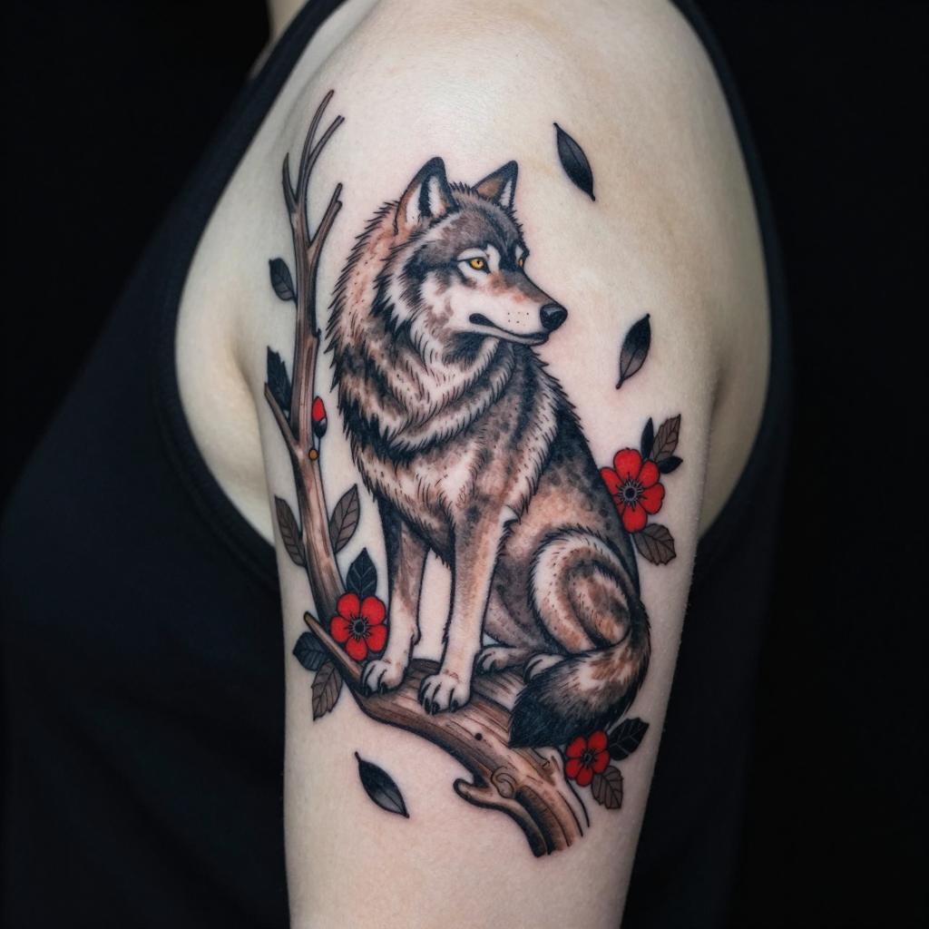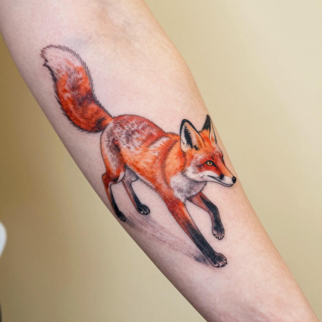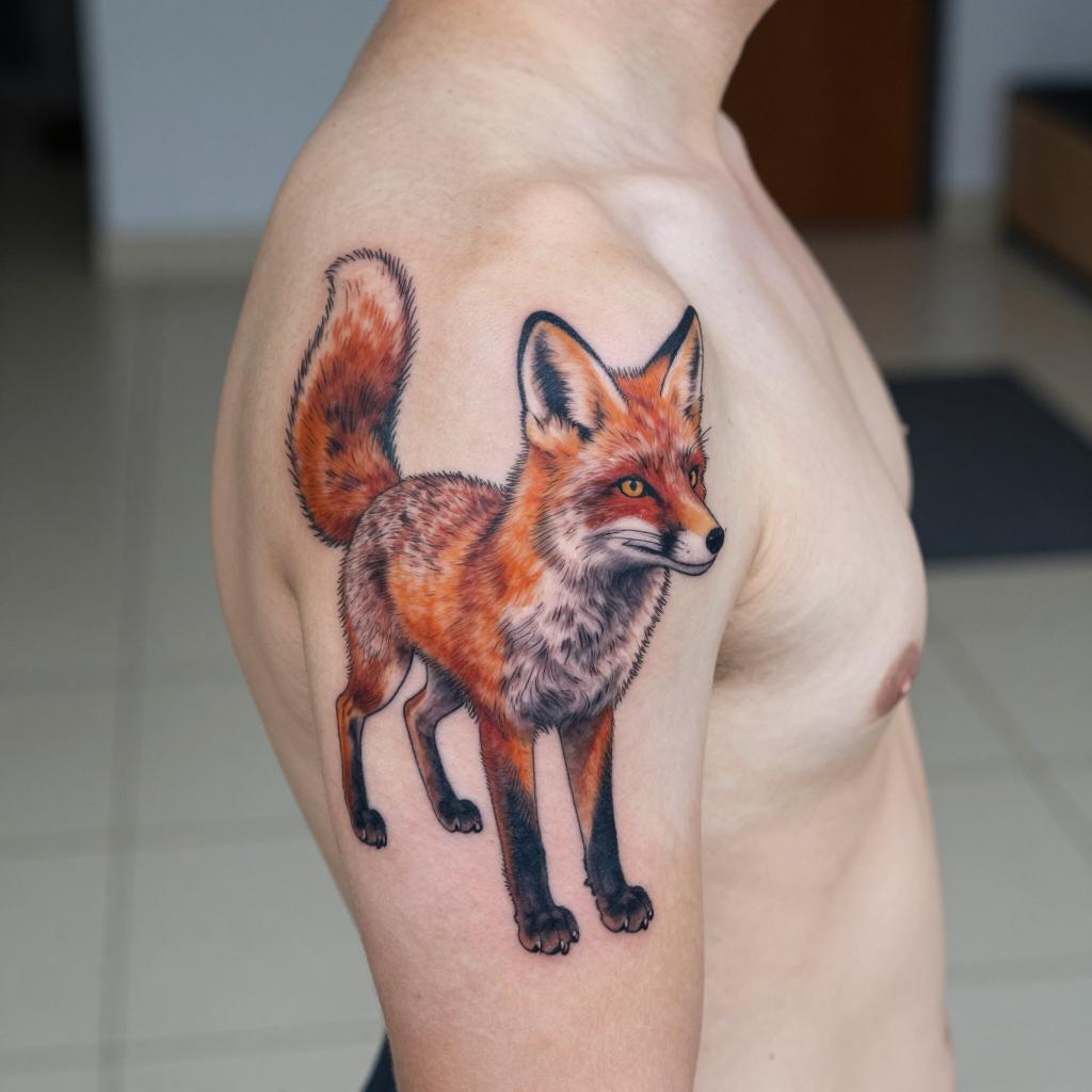 Black and grey tattoo on a person's upper back. A stylized, swirling fox-like creature with flowing, wavy hair and intense eyes. The creature is floating above a vertical line, with abstract, cloud-like shapes in the background. The tattoo has intricate line work and shading. The person has light skin, and only their upper back is visible.