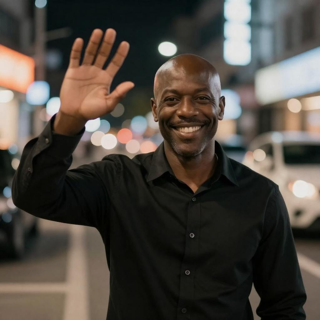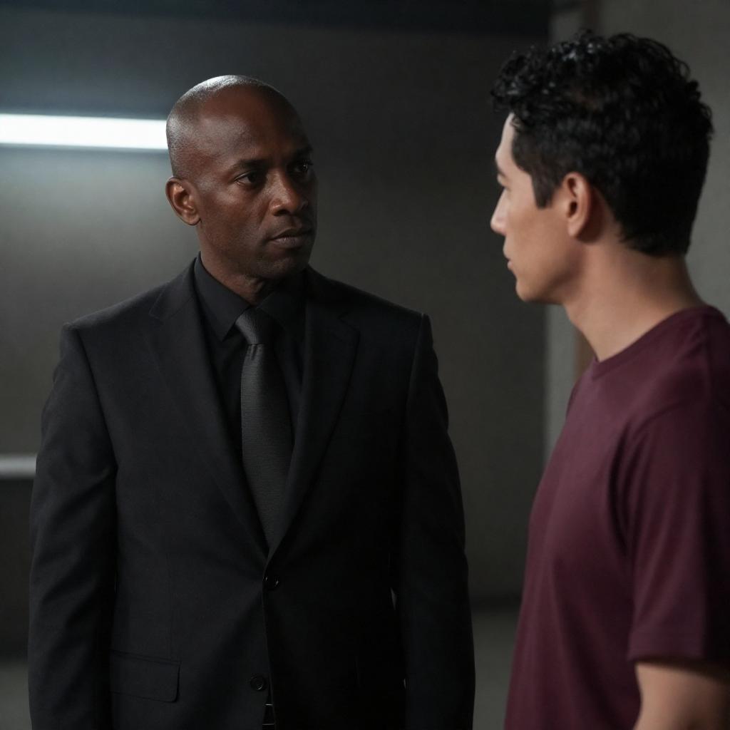 Photograph of a bald Black man with a medium build, wearing a dark blue shirt, facing a man with short brown hair and a black leather jacket. Background includes a blurred urban street scene with a car and people. The man in the foreground looks slightly to the right, while the man in the jacket faces him.