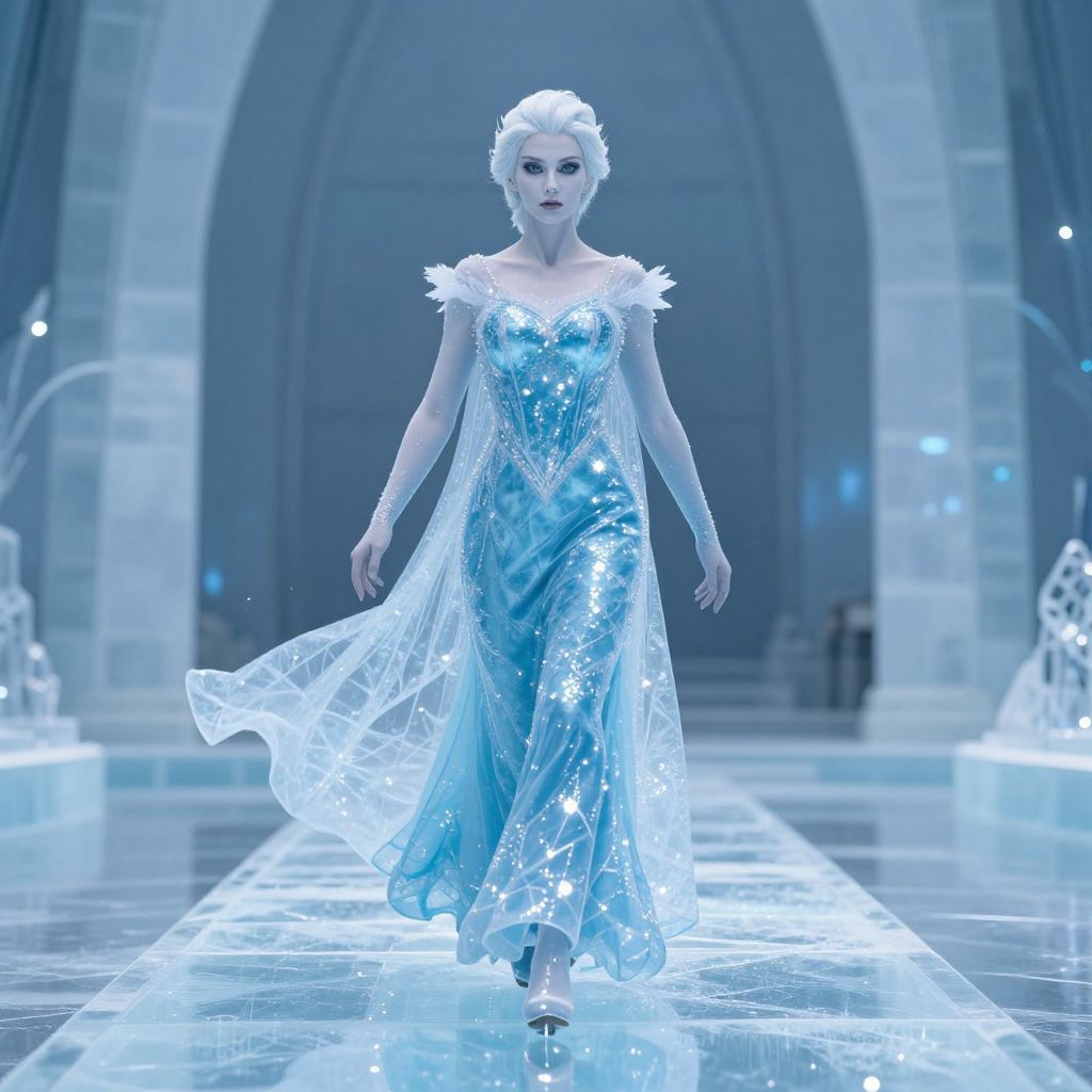 Inside a futuristic ice palace, an ice queen with pale, porcelain skin and sharp, intelligent blue eyes glides on a platform of crystalline ice, her flowing icy-blue dress made of shimmering frost patterns, each movement creating delicate sparkles as she turns to face the camera, realistic cinematic lighting with cold, reflective surfaces and a minimalist, elegant setting