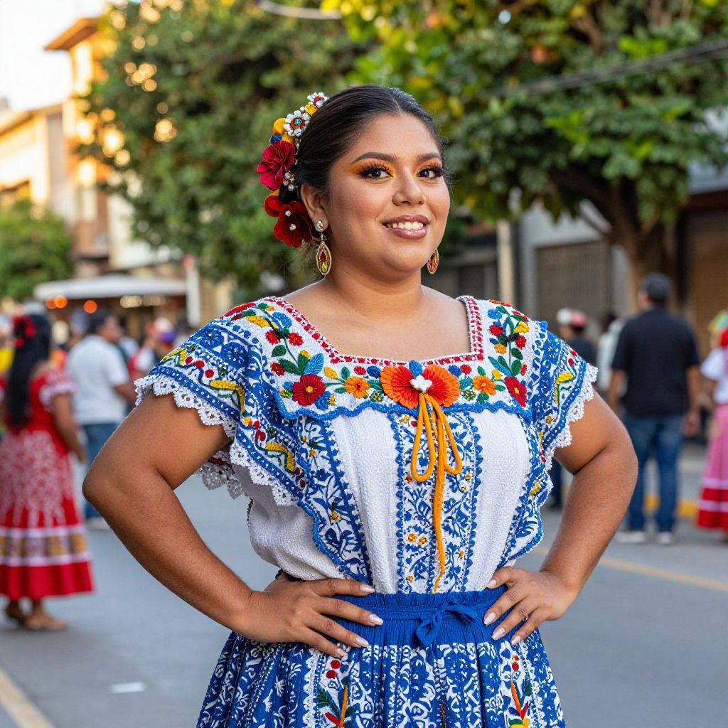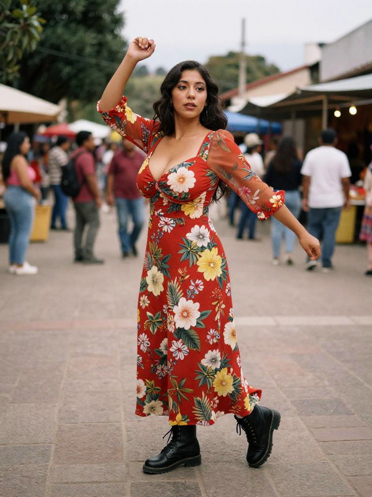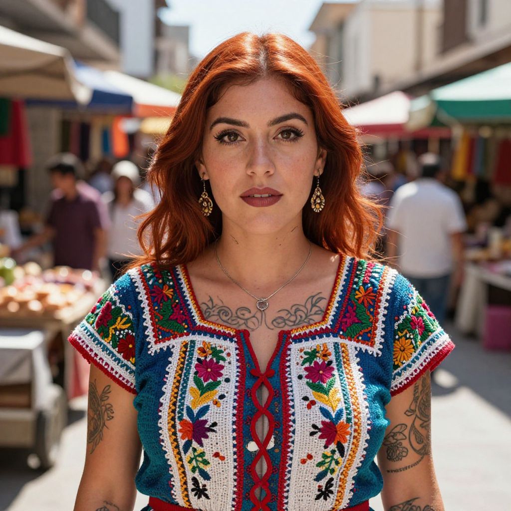 Red haired Latina woman standing in a vibrant urban street market, wearing colorful traditional clothing, sunlit with lively background, expressive eyes, intricate tattoos, warm tones, cinematic lighting, detailed textures.