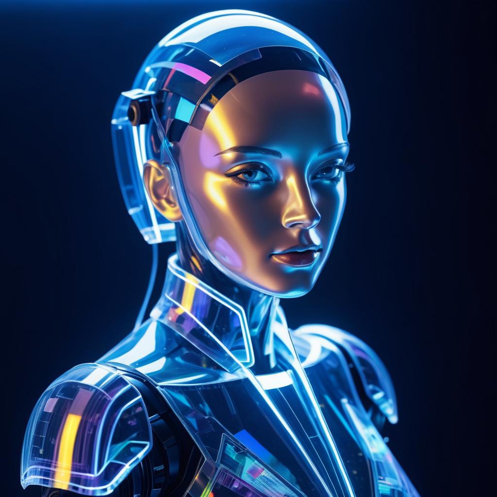 Portrait of a futuristic robot made of transparent plastic with holographic displays, dramatic lighting.
