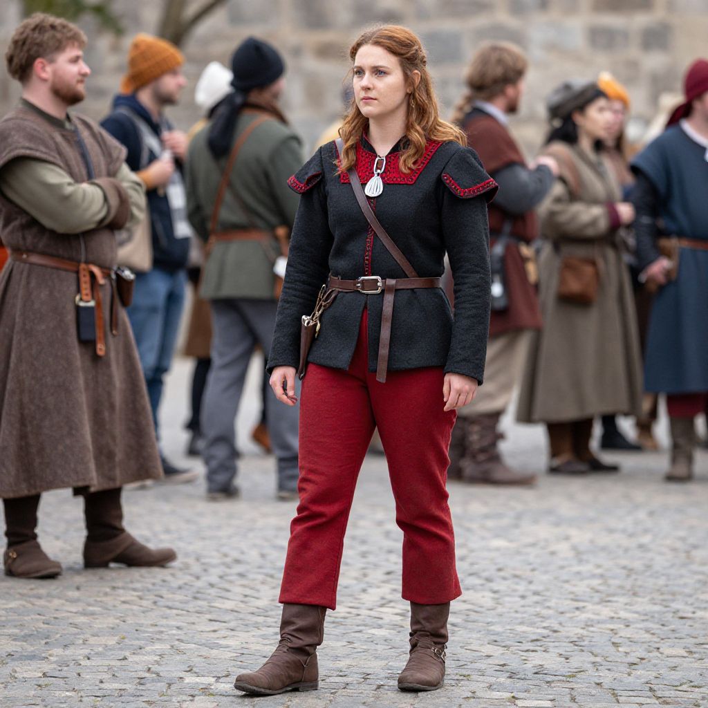 Female in a medieval costume with red pants and a black jacket with red accents and brown boots. The woman is standing on a street with other people in the background.