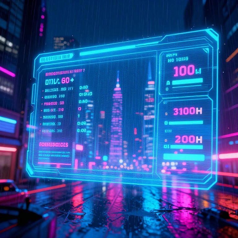 Neon-lit, cyberpunk-style digital screen floating in a rainy city street, displaying financial data in bright blue and pink hues.