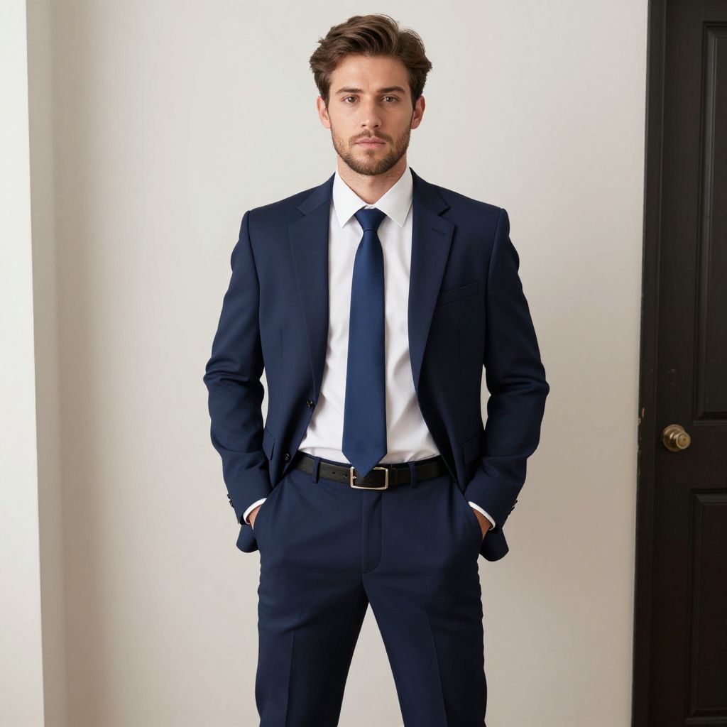 Navy blue jumpsuit formal, 1boy, necktie, male focus, solo, shirt, blue necktie, white shirt, suit, hands in pockets, jacket, formal, belt, pants, collared shirt, indoors, looking at viewer, realistic, facial hair, black jacket, brown hair, standing, cowboy shot, black pants, long sleeves