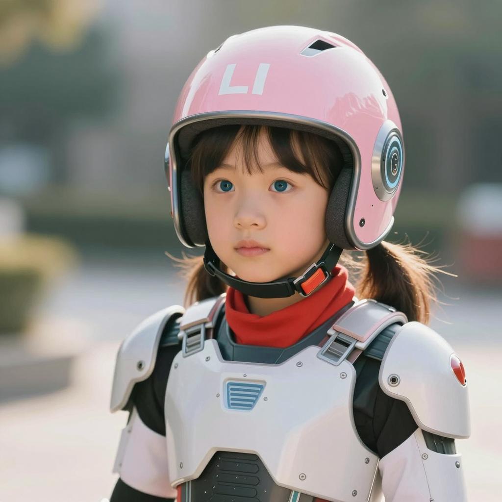 Girl robot costume, photograph of a young girl, realistic CGI, wearing a pink helmet with "LI" on it, red scarf, and futuristic armor, detailed ures, soft sunlight, background blurred with outdoor setting, focused on her face, expressive blue eyes, neutral expression, sunny day, bokeh effect, realistic lighting, detailed armor with metallic and plastic ures, light brown hair in a ponytail, child-sized, innocent and curious look