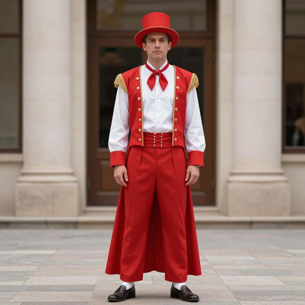 Photograph of a man standing in front of a building with large columns. He is wearing a bright red top hat, red vest with gold epaulettes, white shirt with a red bow tie, and red pants that reach below his knees. The pants have a slight sheen and are paired with black shoes. His expression is neutral, and his arms hang by his sides. The background includes a blurred, dark doorway and light-colored stone columns. The ground is paved with multicolored stones. The overall style is formal and theatrical.