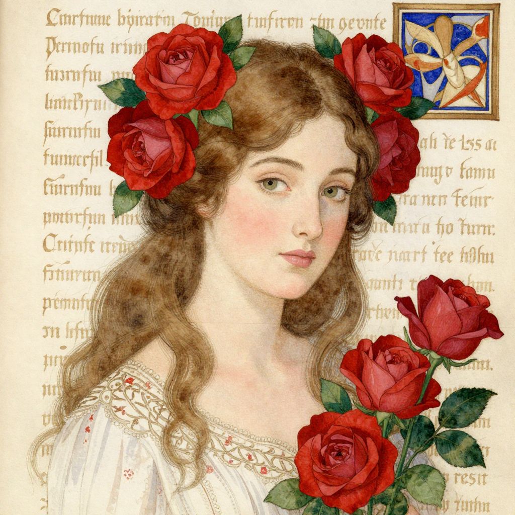This is a digital drawing of a fair-skinned, young woman with wavy brown hair adorned with a crown of vibrant red roses and green leaves. She has soft, pink lips, light brown eyes, and a gentle expression. Red roses also frame her shoulders, adding to the floral theme. The background is a pale, textured parchment with faint, cursive text in brown. The style is reminiscent of classic, romantic illustrations, with detailed, realistic rose petals and delicate, lifelike features on the woman's face.