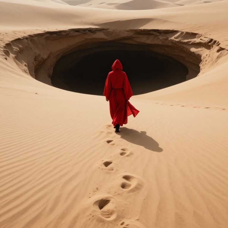 Colossal stone archways frame a luminous portal, casting ethereal light upon a solitary figure standing at its threshold amidst misty desert terrain.