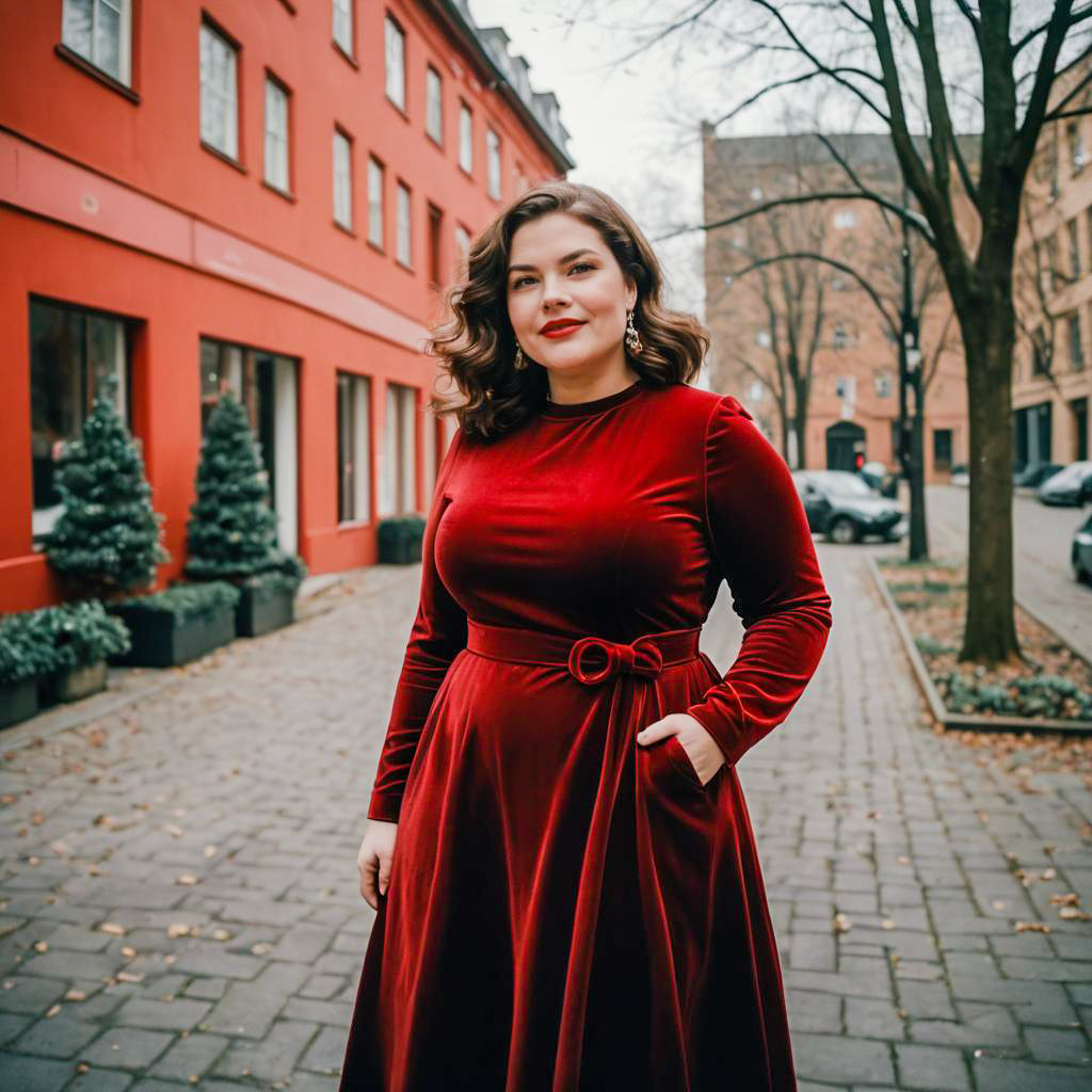 Photo of a Curvy woman, Wavy Lob, christmas outfit, Red velvet dress with long sleeves and A-line, anscochrome analog film