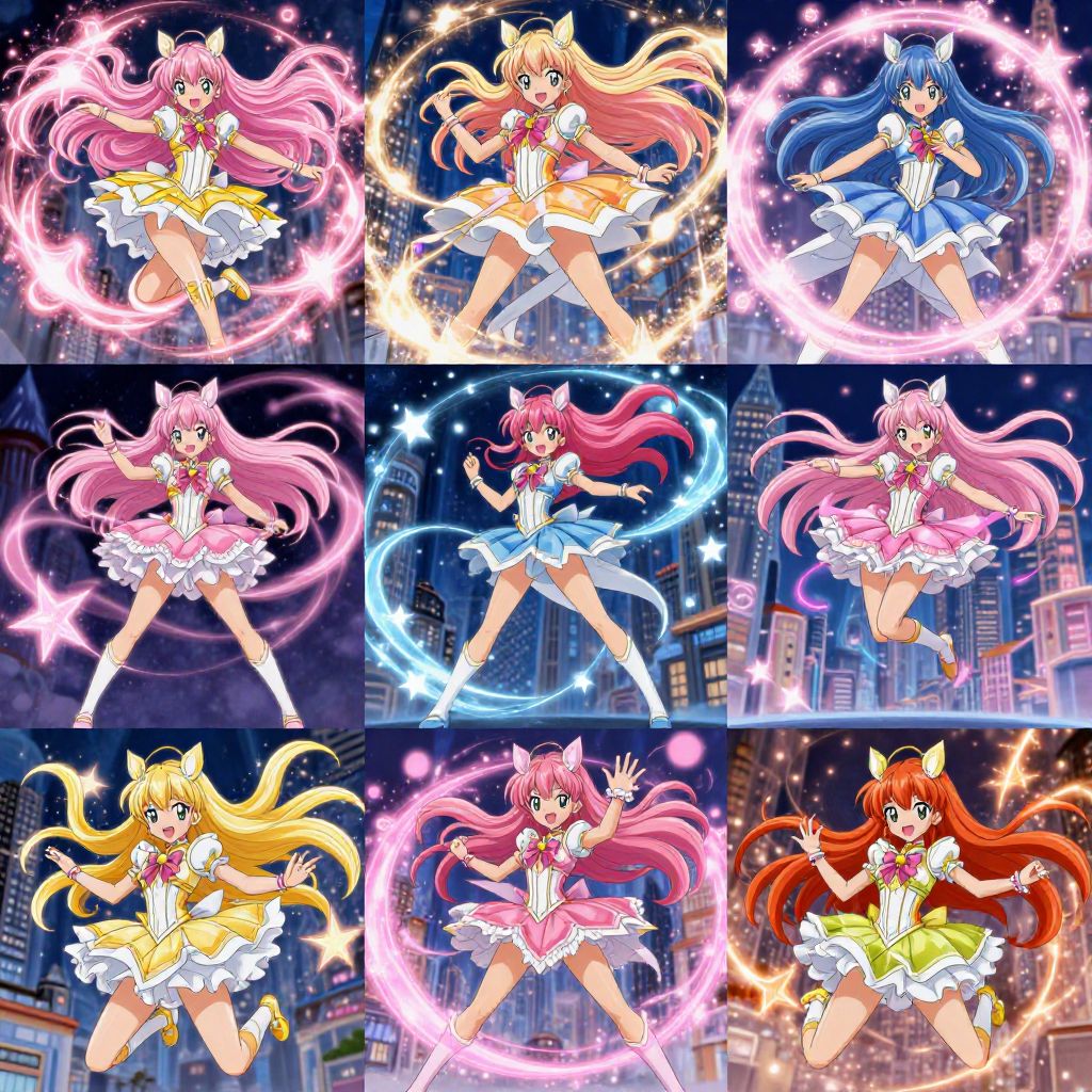 Studio Trigger style magical girl transformation sequence, fluid dynamic motion with glowing particles and magical effects, vibrant pastel colors with sharp highlights, dramatic lighting, detailed costume changes, bold visual storytelling in a fantasy city backdrop.