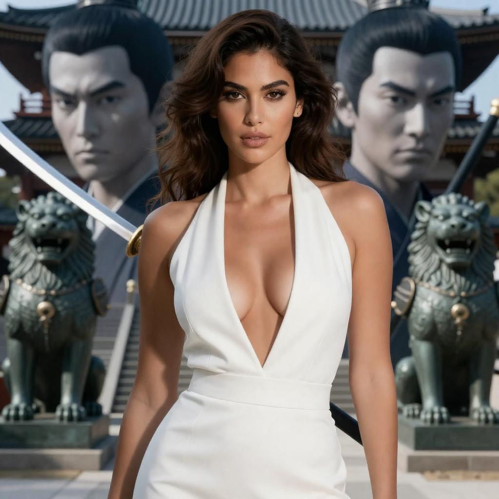 Photograph of a woman and a man sitting on red and orange plastic chairs in a retro-themed room. The woman, with long dark hair and wearing a leopard print dress and high heels, sits with her legs crossed, looking directly at the camera with a confident expression. The man, with short brown hair, wears a light grey shirt and pants, leaning back with a relaxed posture. Background includes a red wall, a large circular wall decoration, and a vintage sign. Red string lights hang above. The woman's left hand rests on the red chair's armrest.