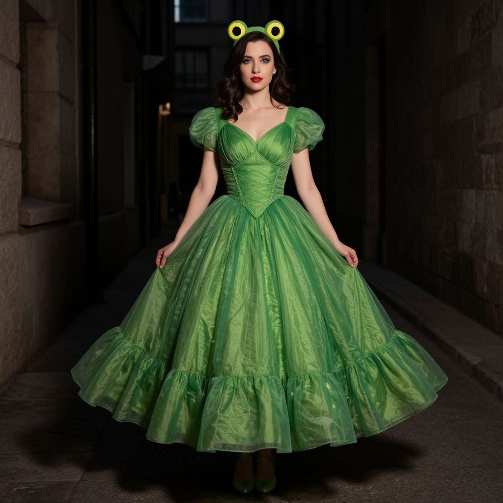 Frog Princess Dress, image of a woman in a green dress in a dark alley