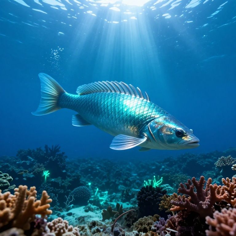 Photograph of a silver fish with dark, vertical stripes swimming underwater. The fish has a sleek, slightly elongated body, large eyes, and translucent, fan-shaped pectoral fins. Its scales shimmer in the sunlight filtering through the water. The background is a vibrant blue, with dark green seaweed and a sandy ocean floor visible in the lower part of the image. The water is clear, allowing for detailed visibility of the fish and the surrounding marine life. The fish is positioned slightly to the left, with its head pointing to the right.