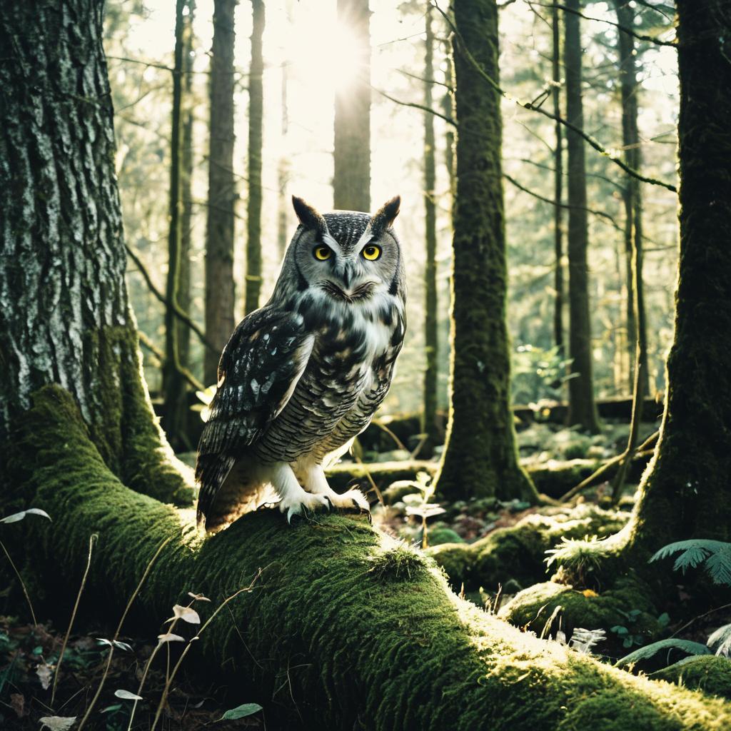 No humans, nature, animal, signature, realistic, outdoors, tree, forest, mossy patches, plant, owl, perched owl, dog, sunlight, leaf, moss, scenery, filtered afternoon, day