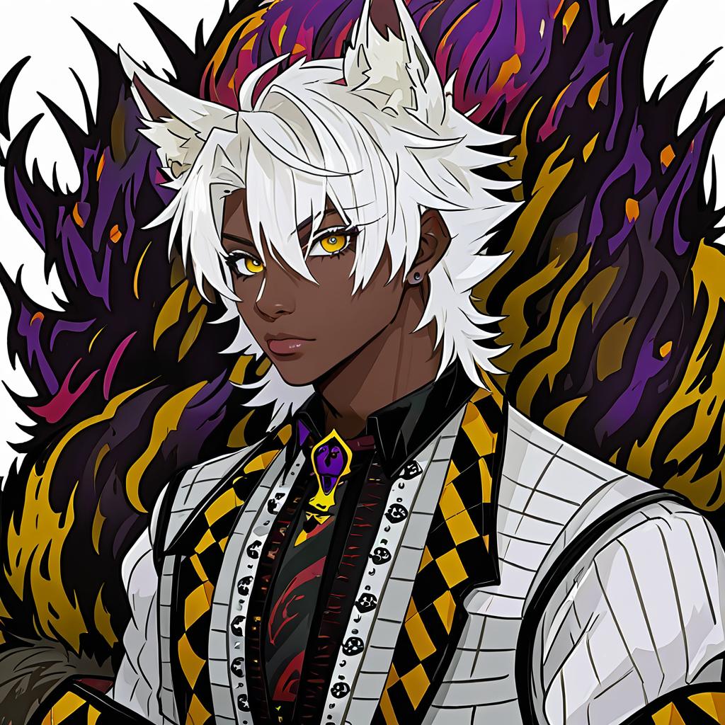 Jack howl, twisted wonderland, 1boy, wolf boy, dark-skinned male, wolf ears, wolf tail, animal ear fluff, yellow eyes, short hair, white hair, by artist morisobo, anime