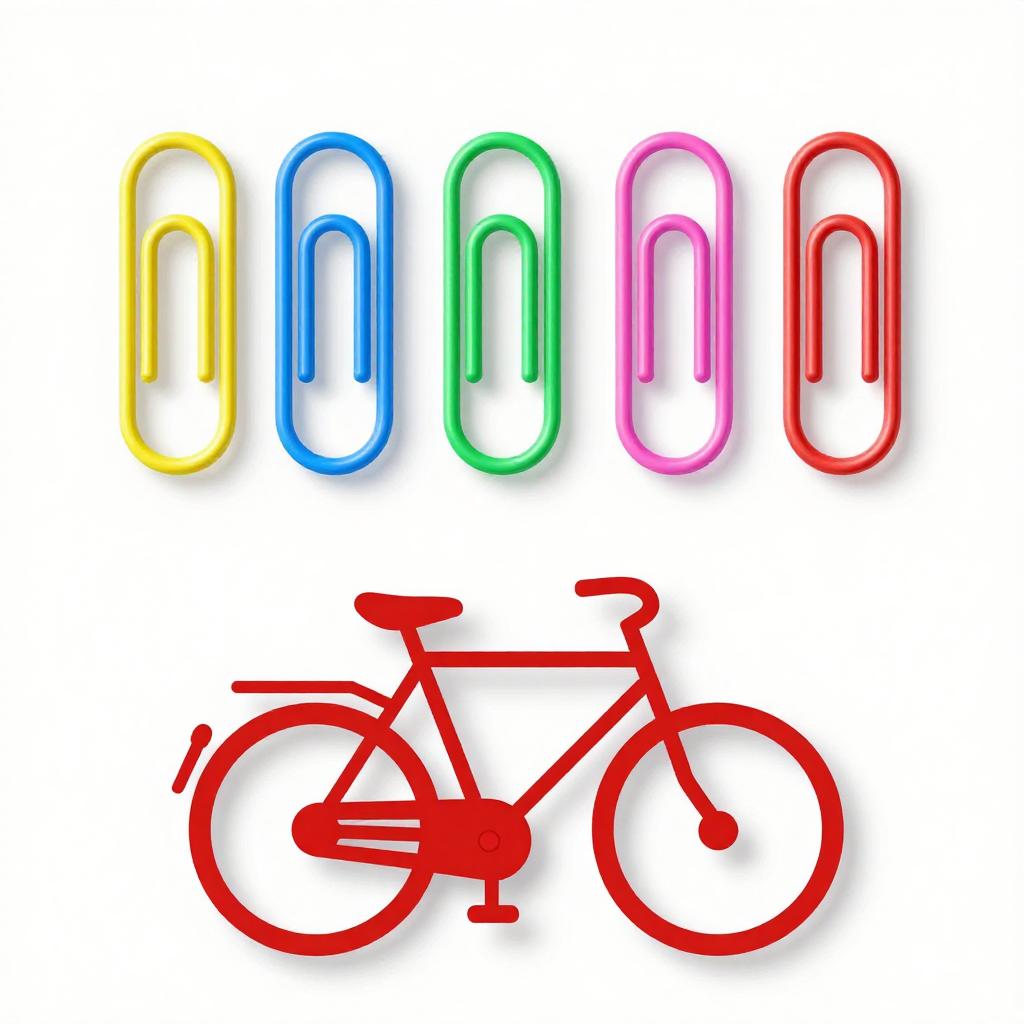 This digital illustration features a vibrant, neon-style design with colorful, outlined paper clips forming a word at the top, and a simple, red, outlined bicycle drawing at the bottom. The paper clips are in yellow, blue, green, pink, and red, creating a bright, playful look. The background is plain white, and the camera angle is straight-on with a shallow depth of field, keeping the entire image in focus. Lighting is even and bright.