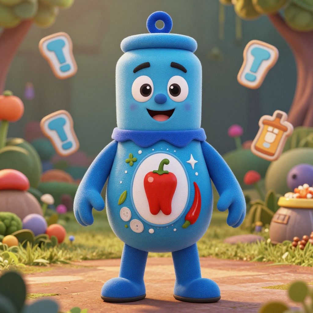 A vibrant CGI image featuring a cute, blue, block-shaped cartoon character with a smiling face, standing in a whimsical forest setting. The character has a round body adorned with a red bell pepper and a chili pepper on a white circle, surrounded by stars and dots. It has black eyes, a blue hat with a circular button, and a blue scarf. In the background, colorful mushrooms, trees, and floating question marks and a first-aid kit add a playful, curious atmosphere. The ground is a soft, earthy path with green grass.