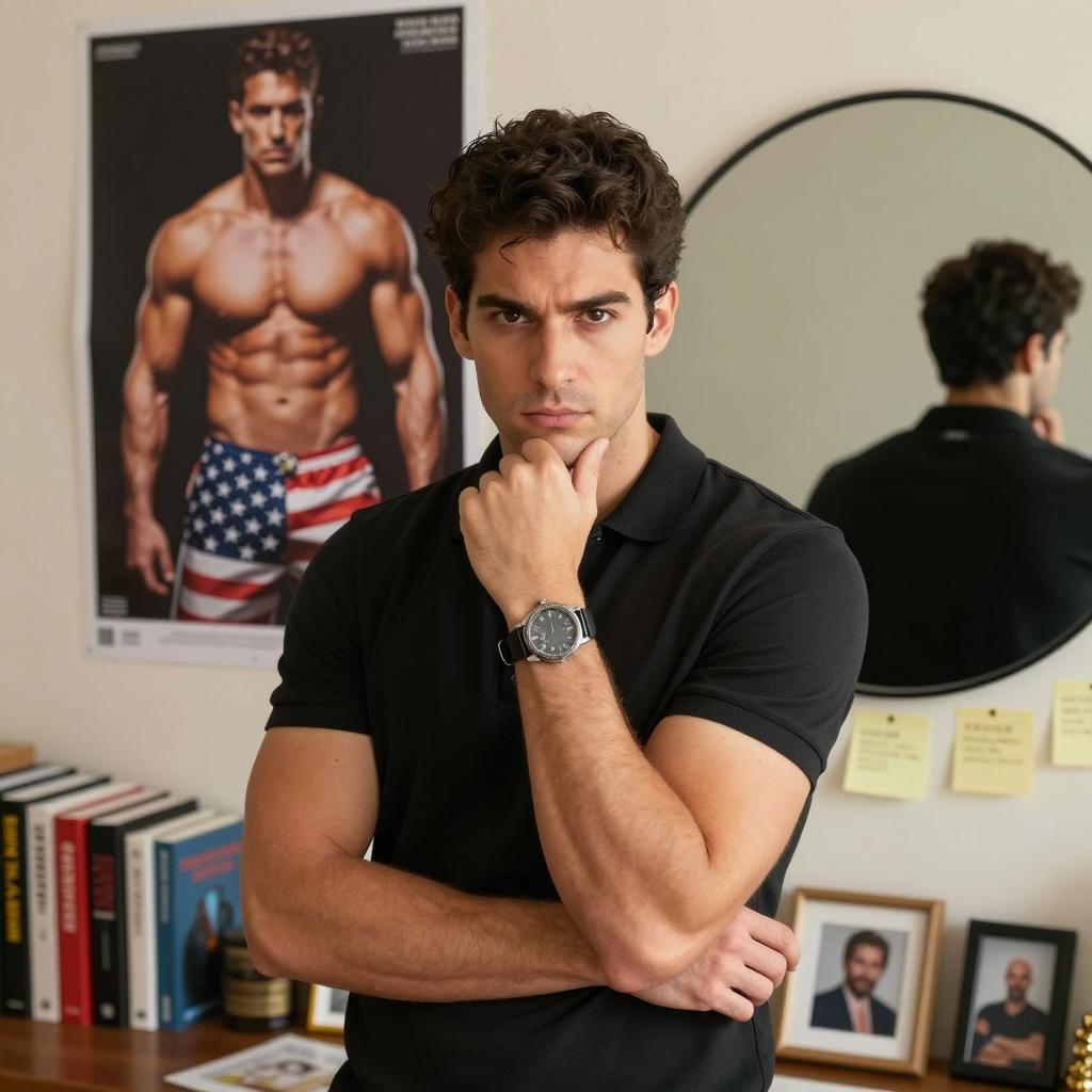 Male with dark hair, black polo shirt, and wristwatch, standing with chin on hand, intense expression. Background: poster of muscular man in American flag shorts, circular mirror, yellow sticky notes on wall, books and photo frame on desk. Reflection in mirror shows same man. One person. Warm lighting.