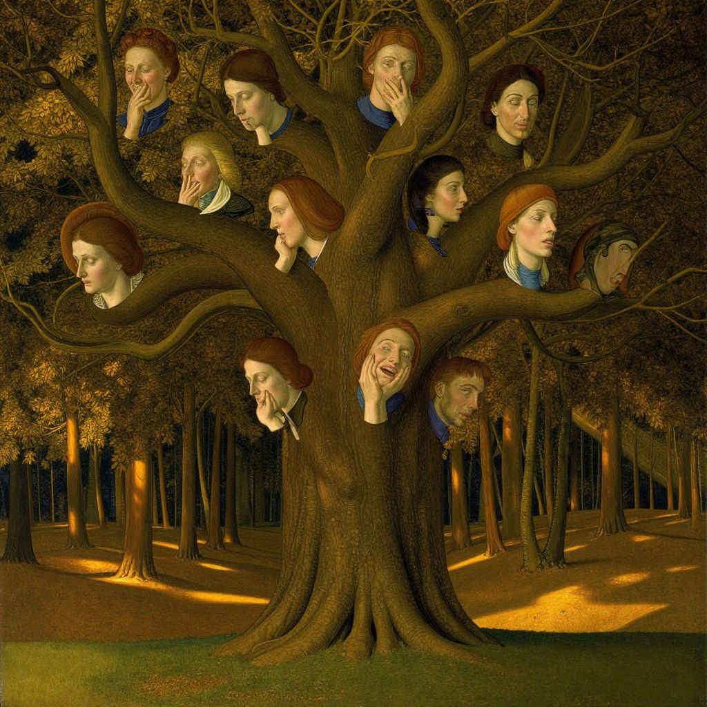 An enigmatic digital art piece evokes the surreal landscapes of Giuseppe Arcimboldo, portraying an ancient tree whose twisted branches transform into a series of human faces. As viewers circle its trunk, they discover various expressions and emotions etched in the bark, from thoughtful contemplation to joyful laughter, creating a narrative that unfolds with each rotation. The scene is illuminated by warm, golden light filtering through the forest canopy, casting elongated shadows that dance along the ground, enveloping the atmosphere in an air of mystery and timeless wisdom.