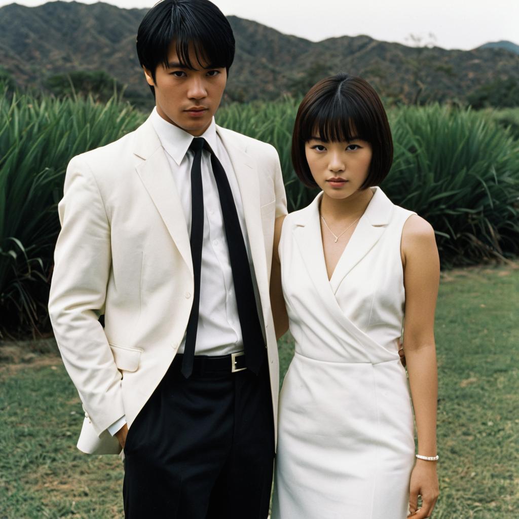Pulp fiction duo costume ,1girl, 1boy, dress, realistic, black hair, asian, white dress, high heels, formal, suit, shoes, pants