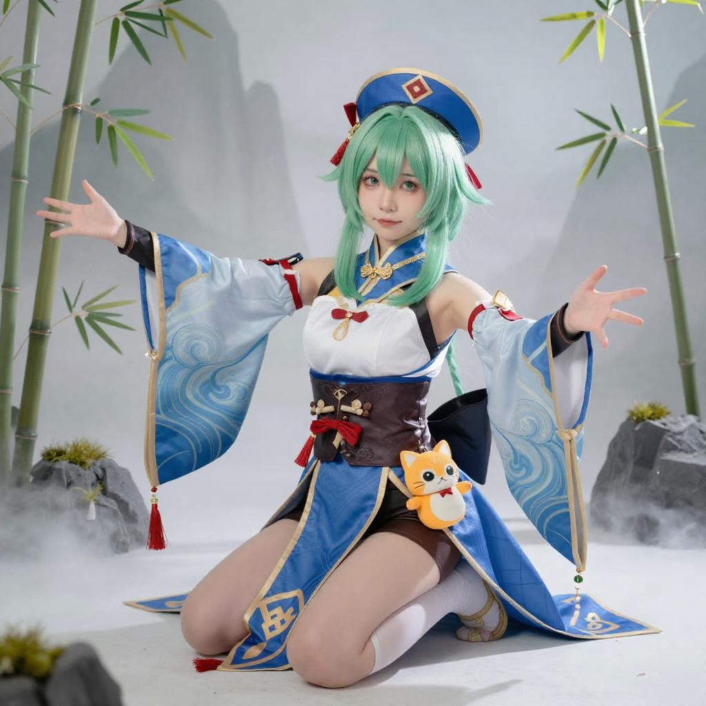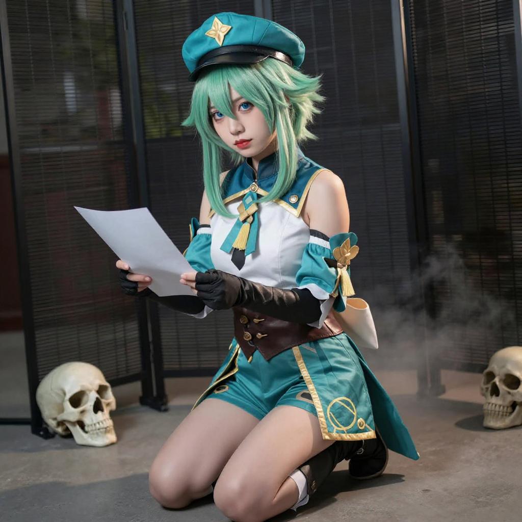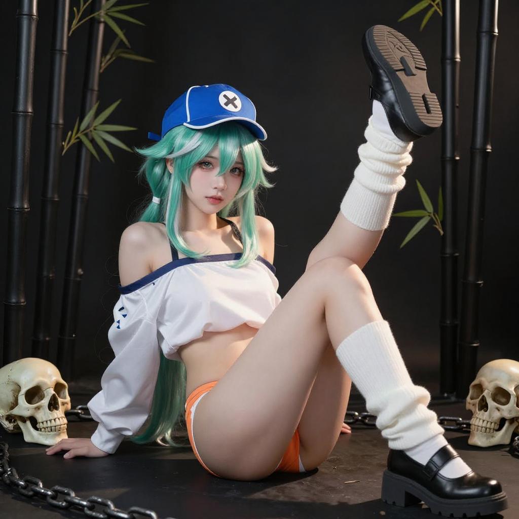 Digital artwork of a green-haired anime girl with blue highlights, kneeling on a wooden floor. She wears a blue hat, red necklace, and a blue-green dress with white sleeves. Her hands hold a white object. The background features black bamboo silhouettes and a skull. The scene has a cool, blue-toned color palette.