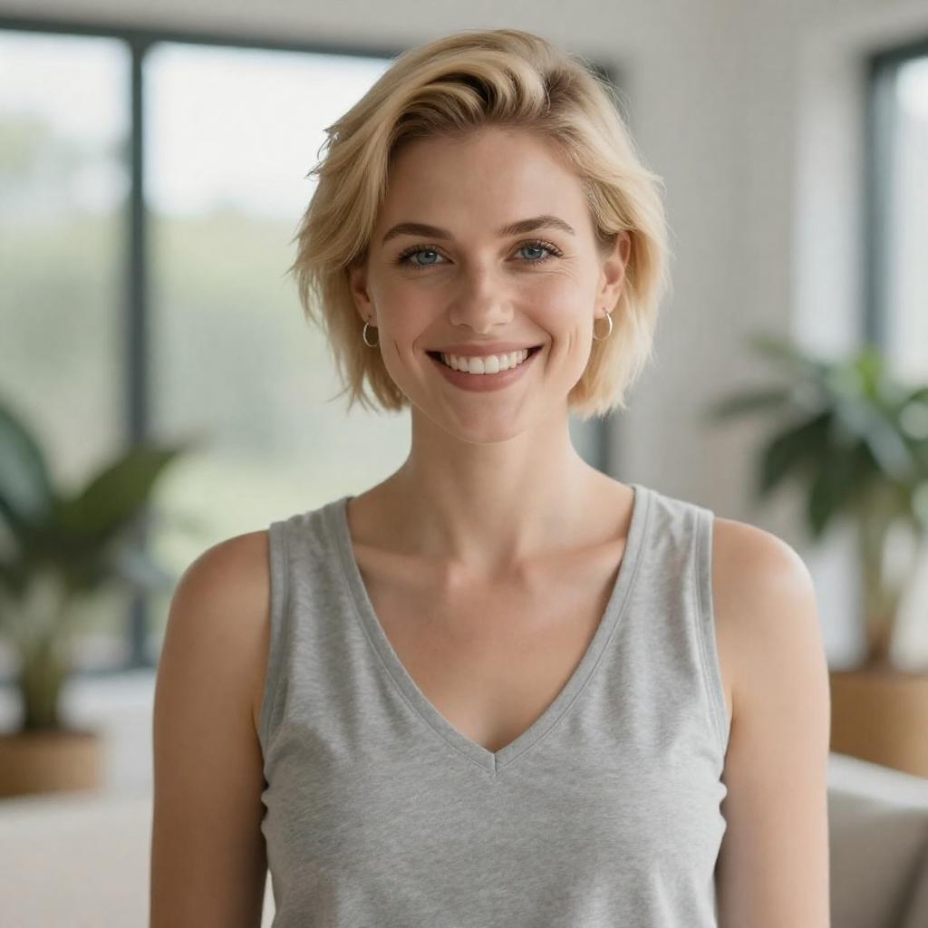 Photograph of a smiling blonde woman with wavy hair, wearing a white sailor hat and blue denim shirt with white buttons. She has fair skin and is looking upward with a joyful expression. Her hands are clasped in front of her. The background is dark, making her light-colored attire and hat stand out.