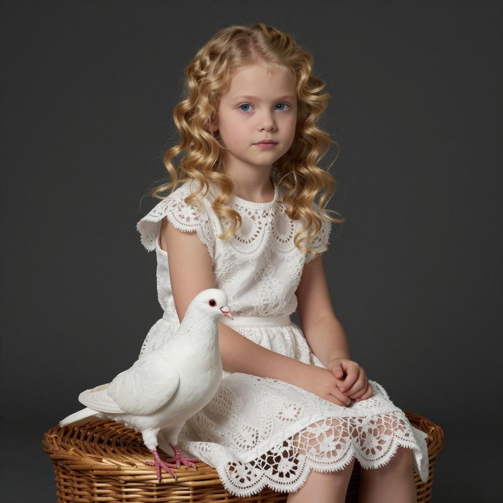Young girl with messy blonde hair, blue eyes, and rosy cheeks, wearing an old-fashioned, lace-trimmed cream dress. Orange long-haired cat with wide yellow eyes sits to her left. Wooden table with bread and cloth in foreground. Rusty, old interior background. Girl's hand rests on table. Cat looks up. Girl's expression is serious.